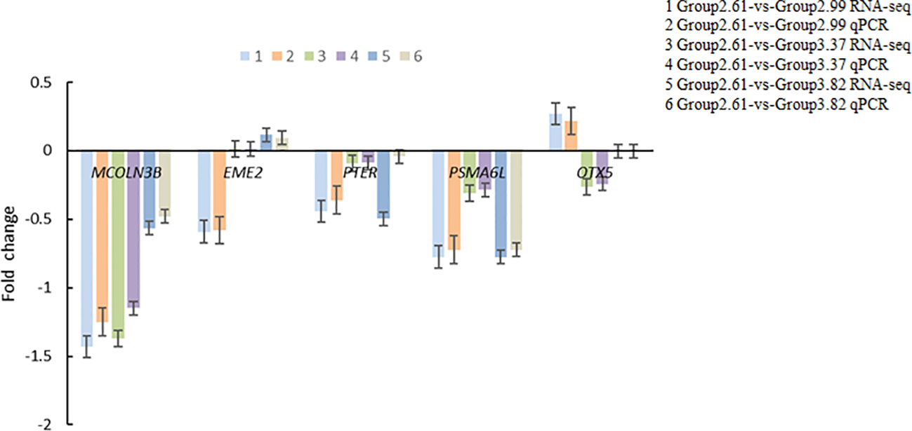 PrimeScript RT Reagent Kit (Takara, Japan) was used to reverse-transcribe 1 μg RNA into cDNA following the manufacturer’s instruction, and eight related genes were selected for quantitative PCR (qPCR) validation. The qPCR was performed with a Bio-Rad CFX-96 real-time PCR system, using a total volume of 20 μL containing SYBR Green Real-time PCR Master Mix (10 μL), primers (0.2 μL, 10 μm), diluted cDNA template (1 μL), and ultrapure water (8.6 μL). The PCR program involved 95°C for 30 s, 40 cycles of 95°C for 5 s, and 60°C for 30 s. The comparative Ct method was used to calculate the relative expression levels of target genes with β-actin as the reference gene. All reactions were performed in triplicate, and the results are presented as mean ± SD.