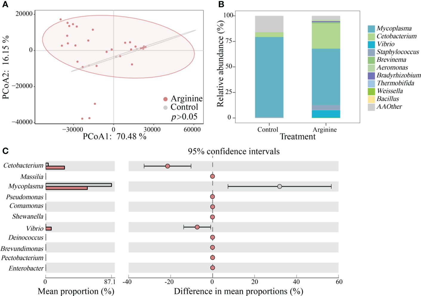 Arginine, an amino acid primarily used in protein biosynthesis, is an indispensable amino acid for fish because of their limited ability to endogenously biosynthesize arginine (Andersen et al., 2016). The ability of arginine to impact nutrient metabolism, influence insulin release, modulate immune and antioxidant response, and improve disease resistance in fish has been well demonstrated (Wang Q. et al., 2021). Arginine could stimulate the secretion of insulin-like growth factor 1 (IGF-1) and activate the TOR signaling pathway to promote protein synthesis for the fish body (Levine et al., 2006; Wei et al., 2021). Studies have shown that 3.61% dietary arginine would significantly improve the weight gain and specific growth rate of rice-field eel (Monopterus albus) (Huo et al., 2023). Furthermore, 2.52% dietary arginine would significantly increase the gene expression of Nrf2 in largemouth bass (Micropterus salmoides) (Yu et al., 2023). Like other animals, lack of arginine may interfere with the fish body normal function of riboflavin, which is not conducive to the synthesis of heme and niacin, as well as decrease resistance against pathogen challenges (Huo et al., 2023). At present, the requirements for dietary arginine have been reported for several fish species, including largemouth bass (Yu et al., 2023), hybrid snakehead (Channa maculata ♀ × Channa argus) (Li et al., 2022), spotted seabass (Lateolabrax maculatus) (Cheng et al., 2021), tiger puffer (Takifugu rubripes) (Wei et al., 2021), and rainbow trout (Oncorhynchus mykiss) (Wang et al., 2022). Arginine function may vary with dose, fish species, fish size, fish health status, and environmental conditions (Azeredo et al., 2015; Hoseini et al., 2020). Therefore, the optimum arginine supplementation level and its physiological function in formulated diets should be carefully evaluated for specific fish species, especially carnivorous fish.
