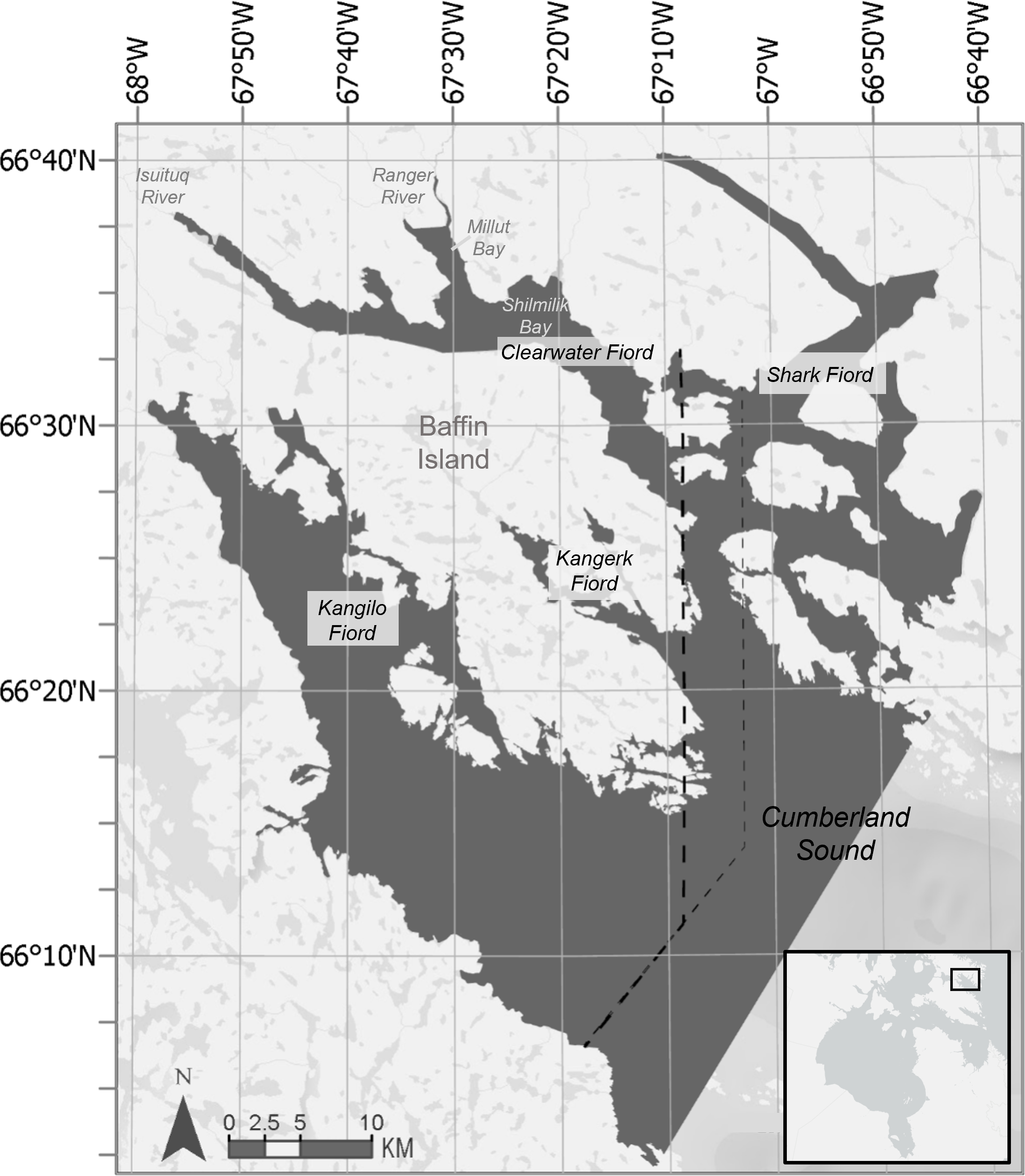Map of northern Cumberland Sound, Baffin Island, Nunavut. Four fiords, Kangilo, Kangerk, Shark, and Clearwater, are indicated. Rivers and bays are labeled in grey. The dark grey shaded area depicts the maximum extent of the satellite images captured in 2022, with 1281 km2 of water covered. The thick dashed line depicts the border of the area used in abundance estimates based on the extent of September 7, 2021 images. The thin dashed line is the image extent for September 4, 2021.