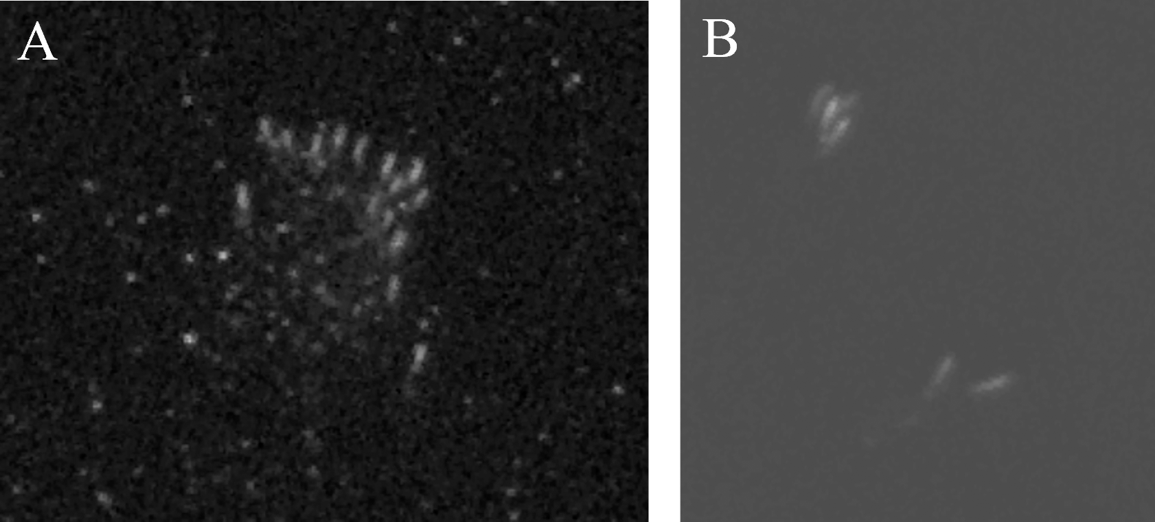 Examples of pod formations in panchromatic 30 cm WorldView-3 satellite images of beluga whales taken on Sept 7, 2021 in Kangilo Fiord, Nunavut (A) and Aug 30, 2020 in Clearwater Fiord, Nunavut (B) (republished under an end user license agreement with Maxar Technologies, original copyright 2021 and 2020, respectively).