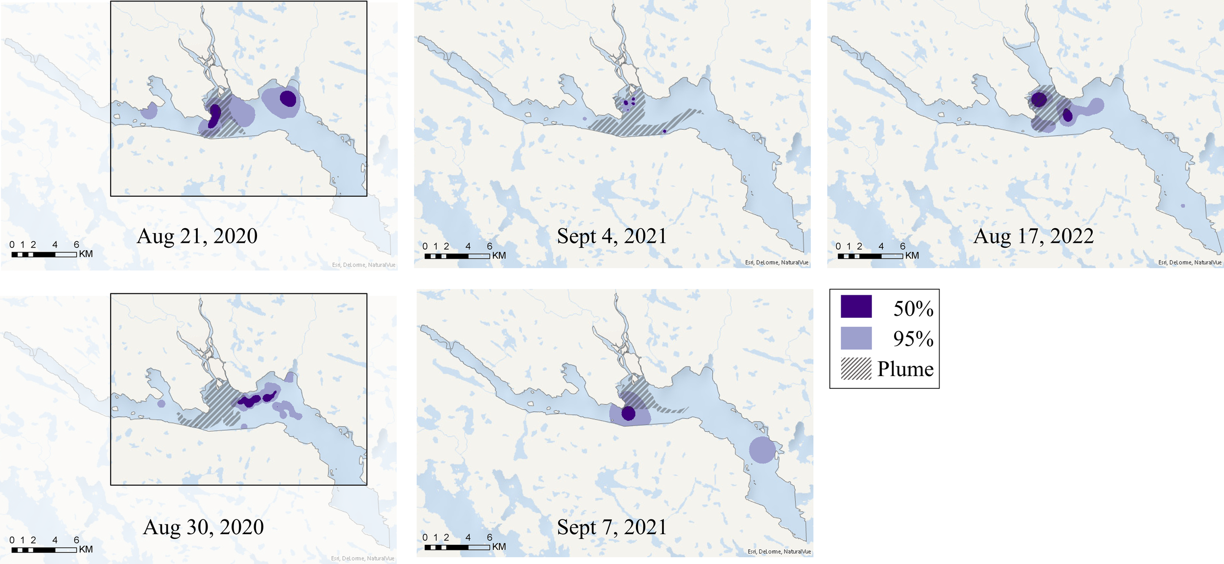 | Date | Plume Area | 95% UD of Clearwater Fiord | 50% UD of Clearwater Fiord | 95% UD of all fiords | 50% UD of all fiords |