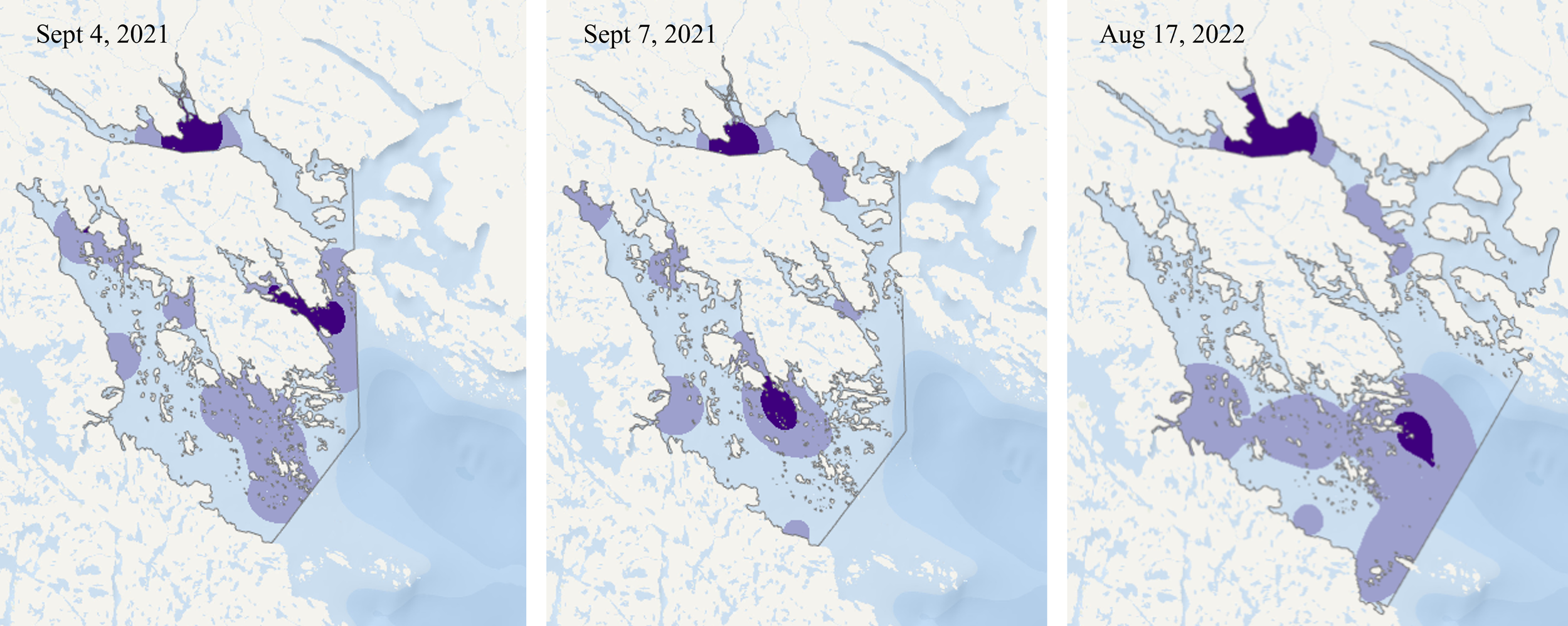 The preference for the two bays in Clearwater Fiord has been previously observed. Hydrophones in Shilmilik Bay recorded five times more calls than the entrance of the fiord, and Millut Bay had 19 times more calls (Booy et al., 2021). The 2014 and 2017 aerial surveys also found beluga whales primarily spread out across Shilmilik Bay and the estuary (Marcoux et al., 2016; Watt et al., 2021a). The August 2017 aerial surveys show movement to and from each area over eight days (four days of observation; Watt et al., 2021a). A similar pattern can be seen in the August 1999 aerial survey. From August 6 to 8, 1999, beluga whales were observed in highest abundance progressively from Shilmilik Bay to the estuary (Richard and Stewart, 2008). The similarity in distribution of beluga whales across time and survey methods further supports the importance of this area as critical habitat for this population, and also demonstrates that satellite imagery is a comparable tool to identify beluga whale distribution.