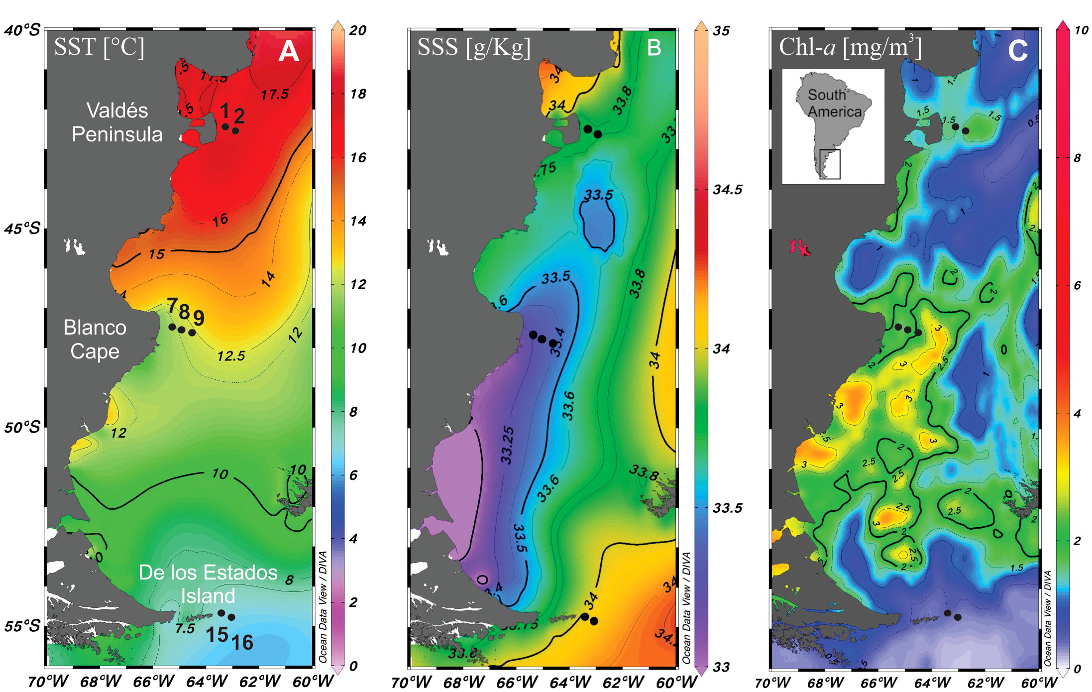 Map of the study area showing the location of sampling stations in the Argentine Sea (black dots). (A) Sea surface temperature (SST), (B) salinity (SSS) and (C) Chl-a distribution.