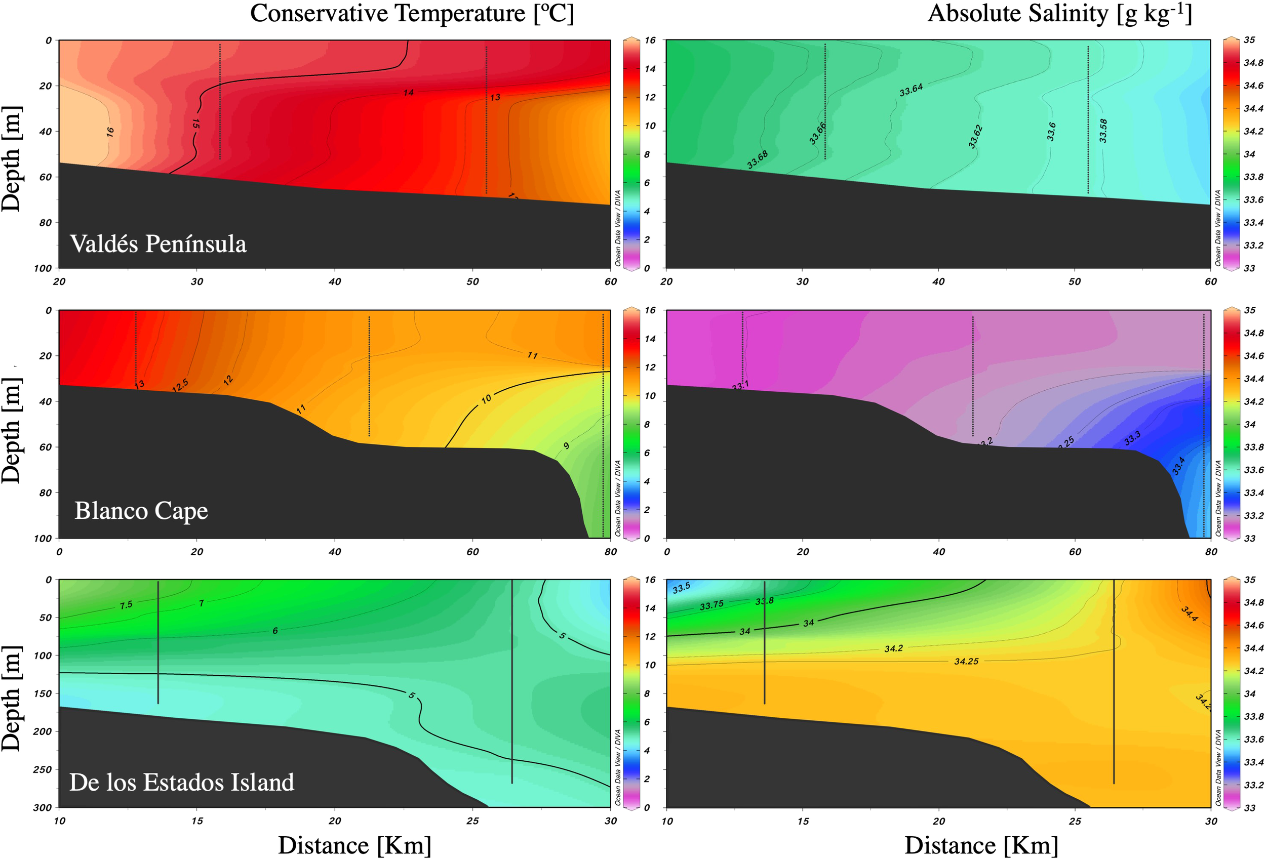 Vertical profiles of temperature and salinity along three frontal areas in the Argentine Sea.