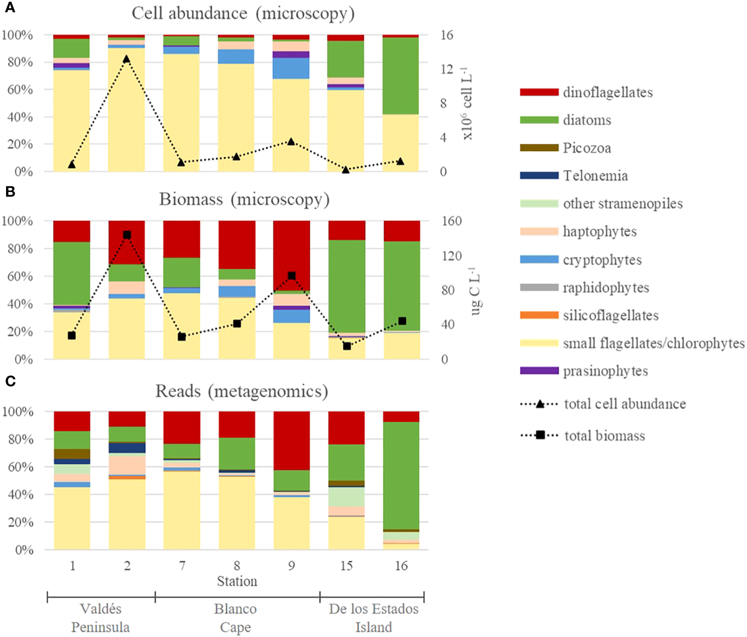Overall phytoplankton composition in frontal areas of the Argentine Sea expressed in relative cell abundances (A) and relative carbon biomass (B) of main phytoplankton groups obtained by microscopy, and relative reads of main phytoplankton groups obtained by metabarcoding (C). Note that small flagellates that could not be identified by microscopy were mostly assigned to chlorophytes based on metabarcoding analysis.