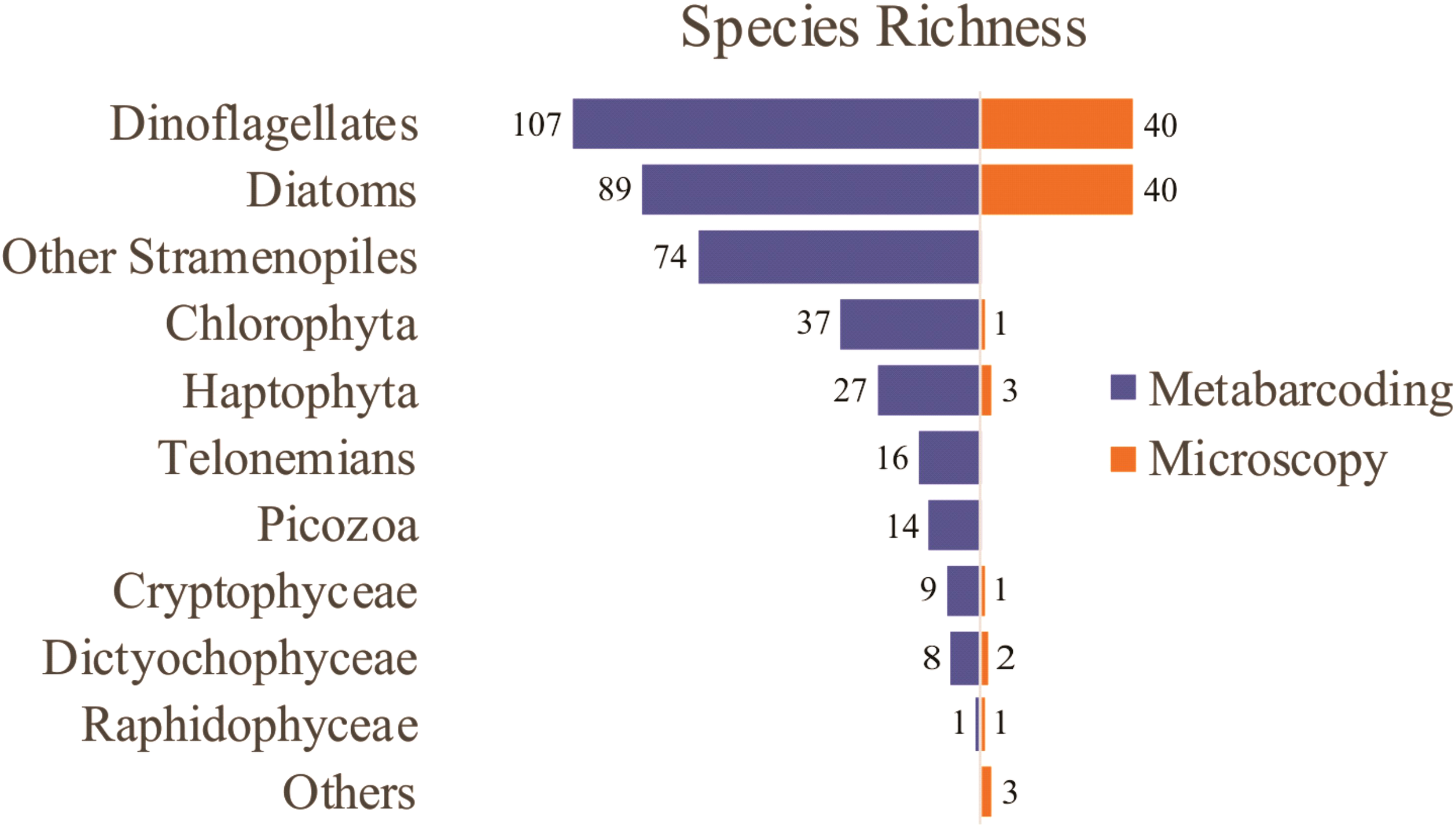 Phytoplankton species richness detected by microscopy and metabarcoding in sampling sites from the Argentine Sea.