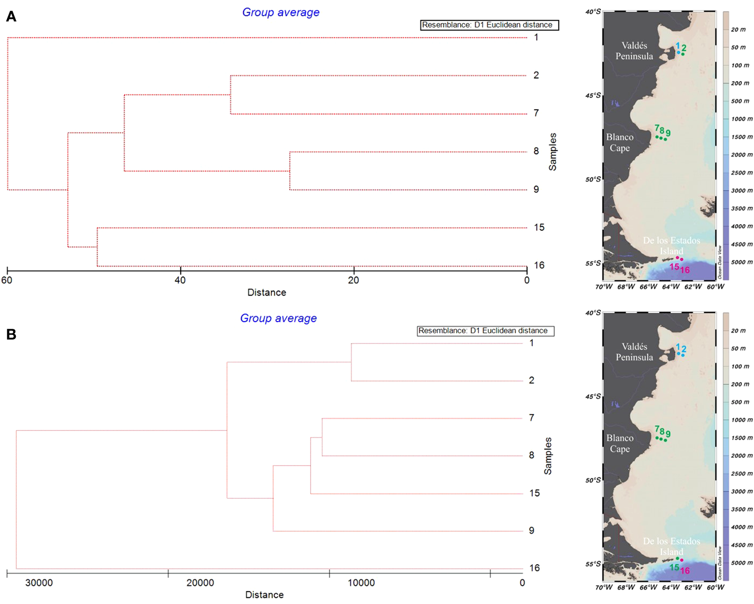 Cluster analyses performed on both relative reads (metabarcoding) and relative biomass (microscopy), grouped the samples into three main groups well related to the geographic location of the sampling stations. Stations 7-9 (Blanco Cape) clustered closely, while the most norther station 1 (Valdés Peninsula) and the most southern station 16 (De los Estados Island) clustered both separately outside the Blanco Cape cluster. Differences in the clustering were observed between the methods for stations 2 and 15. Station 2 clustered with station 1 based on the metabarcoding data, but with stations 7-9 based on the microscopic data, while Station 15 clustered with station 16 based on the microscopic data and with stations 7-9 based on the molecular data. We consider that these differences were largely due to the higher taxonomic resolution provided by metabarcoding, particularly of small flagellates identified as a single group by microscopy, and to differences in the detection of dominant diatoms by both methods (St. 1 and 16). Microscopy separated St. 1, north of Valdés Peninsula, from the rest of the stations mainly because of the high relative biomass of the diatom Asterionellopsis glacialis, which was not reflected in terms of relative reads. This is a major bloom-forming species in coastal areas worldwide, for which high cryptic diversity has recently been observed (Kaczmarska et al., 2014). The low values of relative reads corresponding to Asterionellopsis could be associated, among other factors, to its particularity of producing extracellular mucous-like compounds, which has been observed to interfere with DNA amplification (Odebrecht et al., 2013; Uyua et al., 2014). However, we have no way of testing whether these compounds were indeed present and if so whether they affected other species in the sample as well as Asterionellopsis causing a reduction in total reads. In any case, this is something we cannot determine due to the compositional nature of metabarcoding, which prevents us from comparing the numbers of total reads obtained in different samples (Gloor et al., 2017). Moreover, our metabarcoding data suggest that small flagellated prasinophyte species could represent a widespread and important component of phytoplankton assemblages in the Argentine Sea during late spring or summer, further contributing to the differences in the clustering observed between the methods. An important bloom of the chlorophyte species Pycnococcus provasolii was observed on the stratified side of Valdes Peninsula, in accordance with microscopic observations. This is a little known, small (≈1.5–4 μm) and coccoid species described based on cell cultures from the northwestern Atlantic and the Gulf of Mexico (Guillard et al., 1991), which has been tentatively identified by transmission electron microscopy in the Strait of Magellan (≈52°-54°S) dominating phytoplankton during summer (Zingone et al., 2011). Likewise, pigments mostly associated with chlorophytes in coincidence with a massive bloom of up to 59.1 × 106 cells L-1 of a picoplanktonic (<3 μm) coccal cells of an unidentified chlorophyte, were detected in the shelf-break frontal area of the Argentine Sea during late spring (Carreto et al., 2008). Moreover, a small coccal cell (3 μm) possibly belonging to the group of prasinophytes was an important component of phytoplankton assemblages in stratified waters north of 52°S during a summer oceanographic cruise in the southern Argentine Sea (Antacli et al., 2018). Thus, we consider the Pycnococcus provasolii bloom detected during January in our study could represent a later stage of phytoplankton succession at Valdés Front area.
