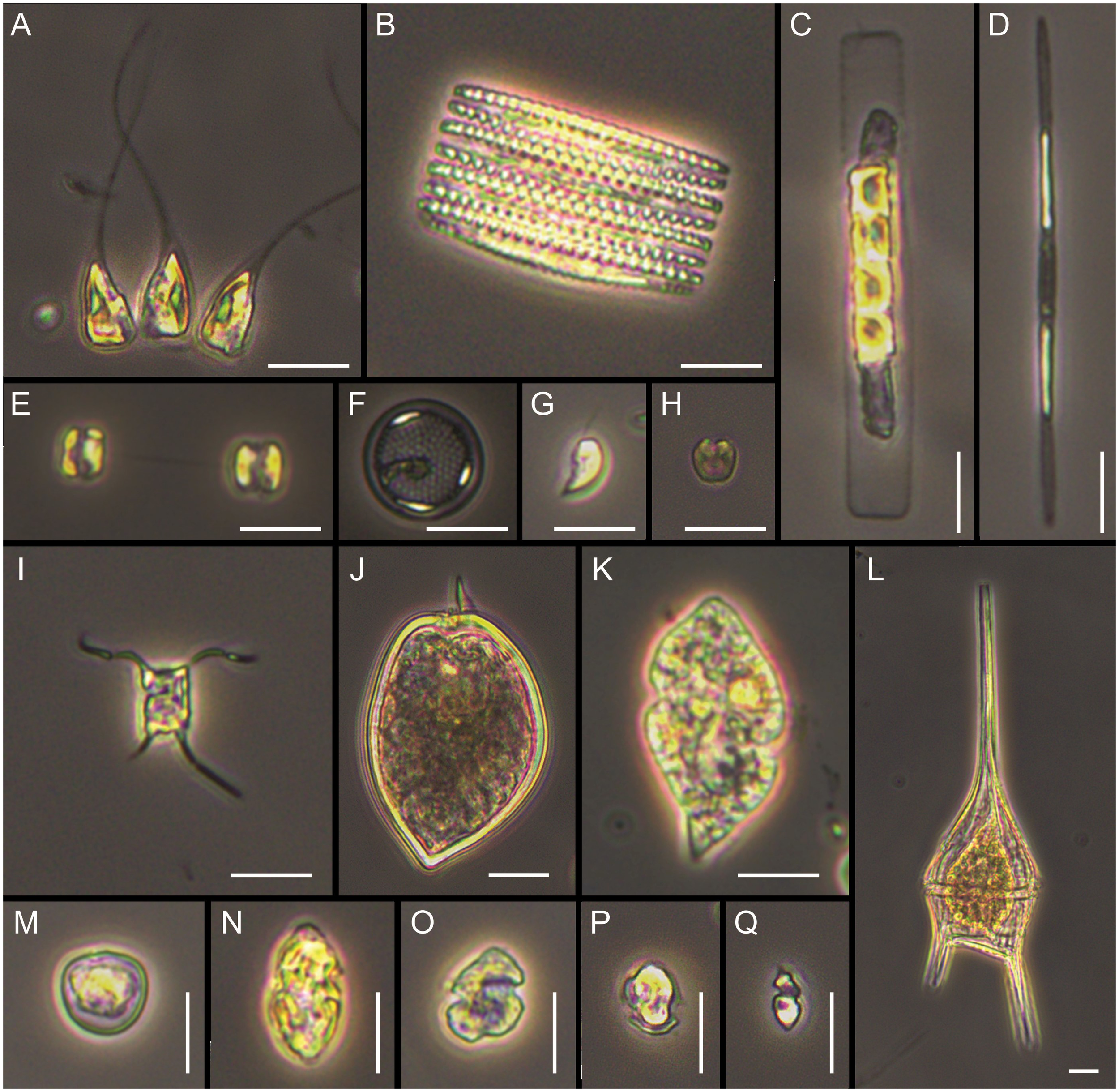 Main taxa observed under light microscopy. (A)Asterionellopsis glacialis, (B)Fragilariopsis kerguelensis, (C)Guinardia delicatula, (D)Pseudo-nitzschia aff. turgiduloides, (E, F) unidentified small centric diatoms, (G) unidentified cryptophyte, (H) unidentified prasinophyte, (I)Attheya aff. septentrionalis, (J)Prorocentrum micans, (K)Gyrodinium sp., (L)Tripos lineatus, (M)Prorocentrum cordatum, (N, O) gymnodinoid dinoflagellates, (P) small thecate dinoflagellate, (Q) small naked dinoflagellate. Scale bars = 10 µm.