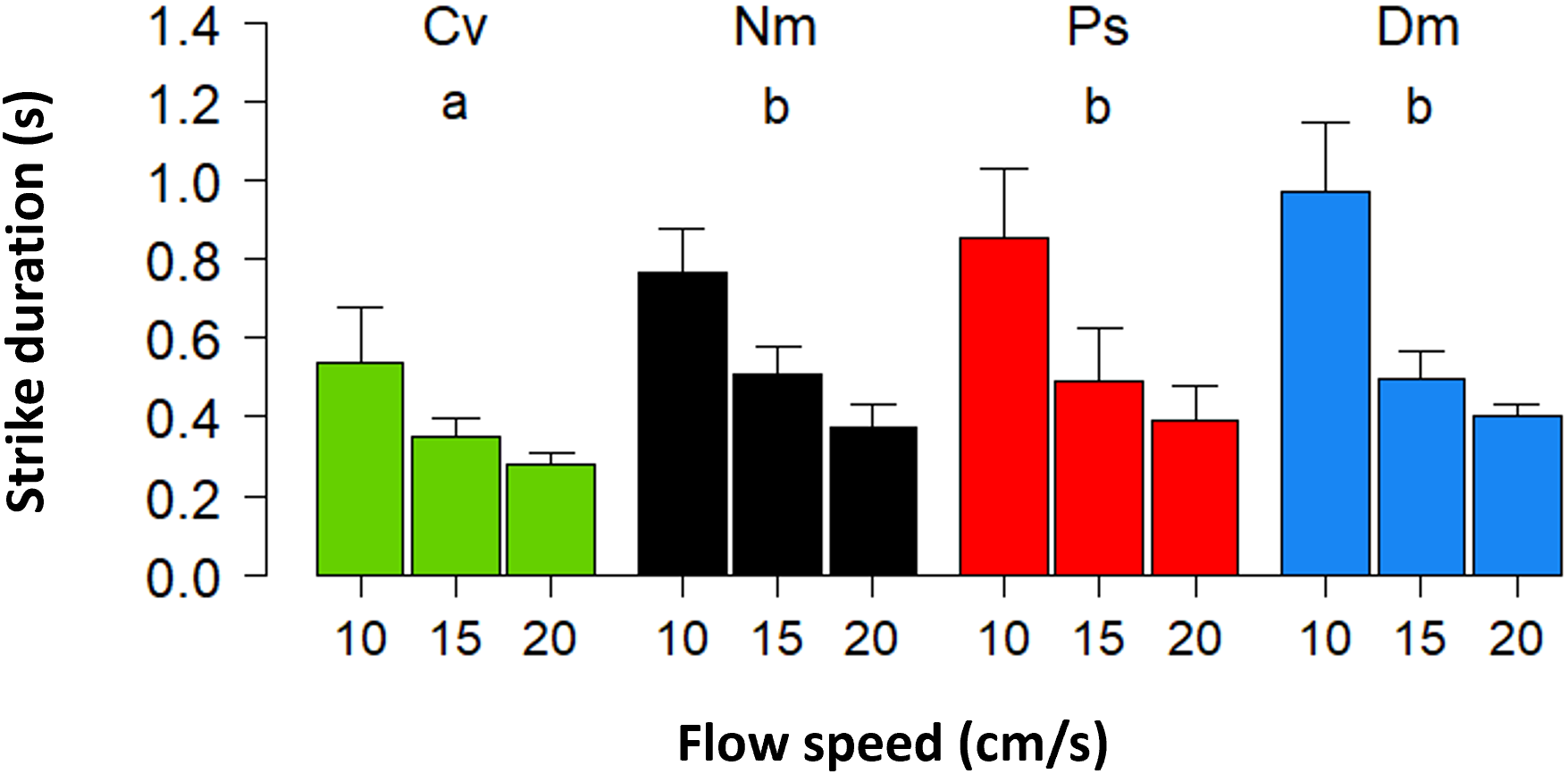 The shorter strike distances under stronger flow corresponded to a significant decrease in the strike duration (Figure 2, Repeated Measures ANOVA, F(2)=163 P<0.0001). Also here, the effect of species was significant (F(3)=9 P<0.0008) with a post hoc test indicating that the strike duration in Cv was significantly shorter than in all other species (Tukey, P<0.03). The interaction between species and flow was significant (F(6)=5 P<0. 0008), reflecting a weaker flow effect on Cv, compared with all other species.