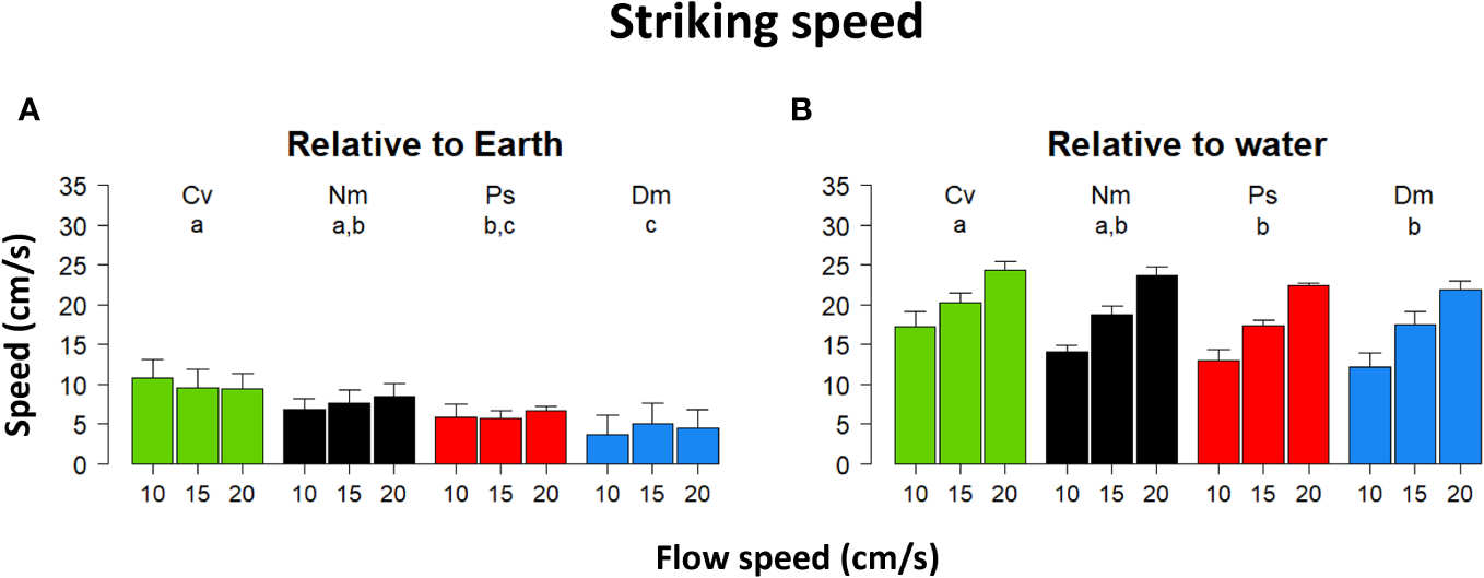 Strike distance vs. flow speed. Mean (± SD) of the (A) - total strike distance in 3D, (B) - the horizontal component of the strike, and (C) - the vertical component of the strike under flow speeds of 10, 15, and 20 cm/s. Species are color coded (Cv-green, Nm-black, Ps-red, Dm-blue) and their acronyms indicated above the bars. Small letters above the bars in (C) - indicate the results of post hoc testing of inter-specific differences, so that pair of species that significantly differed (P<0.05) are indicated using different letters.