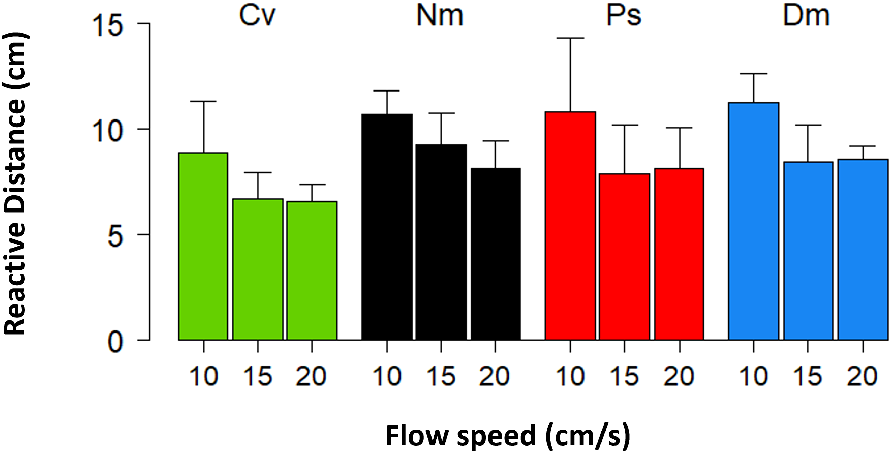 Reactive Distance vs. flow speed. Mean (± SD) Reactive Distances for cases in which the prey drifted almost directly (≤45°) toward the fish. Species are coded as in Figure 1.