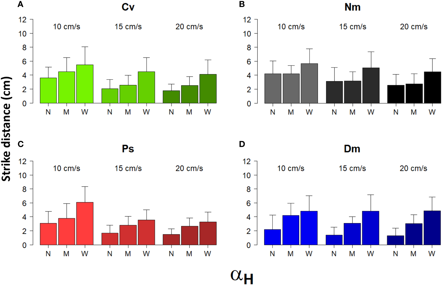 Strike distance under different categories of αH and different flow speed. Shown are the mean (± SD) distances in 3D of strikes performed under different flow speeds (between bar triplicates) in the three different categories of αH: N-narrow, M-mid, and W-wide (within bar triplicates) for the 4 different species (A)-Cv, (B)-Nm, (C)-Ps, and (D)-Dm (color coded as in Figure 1).