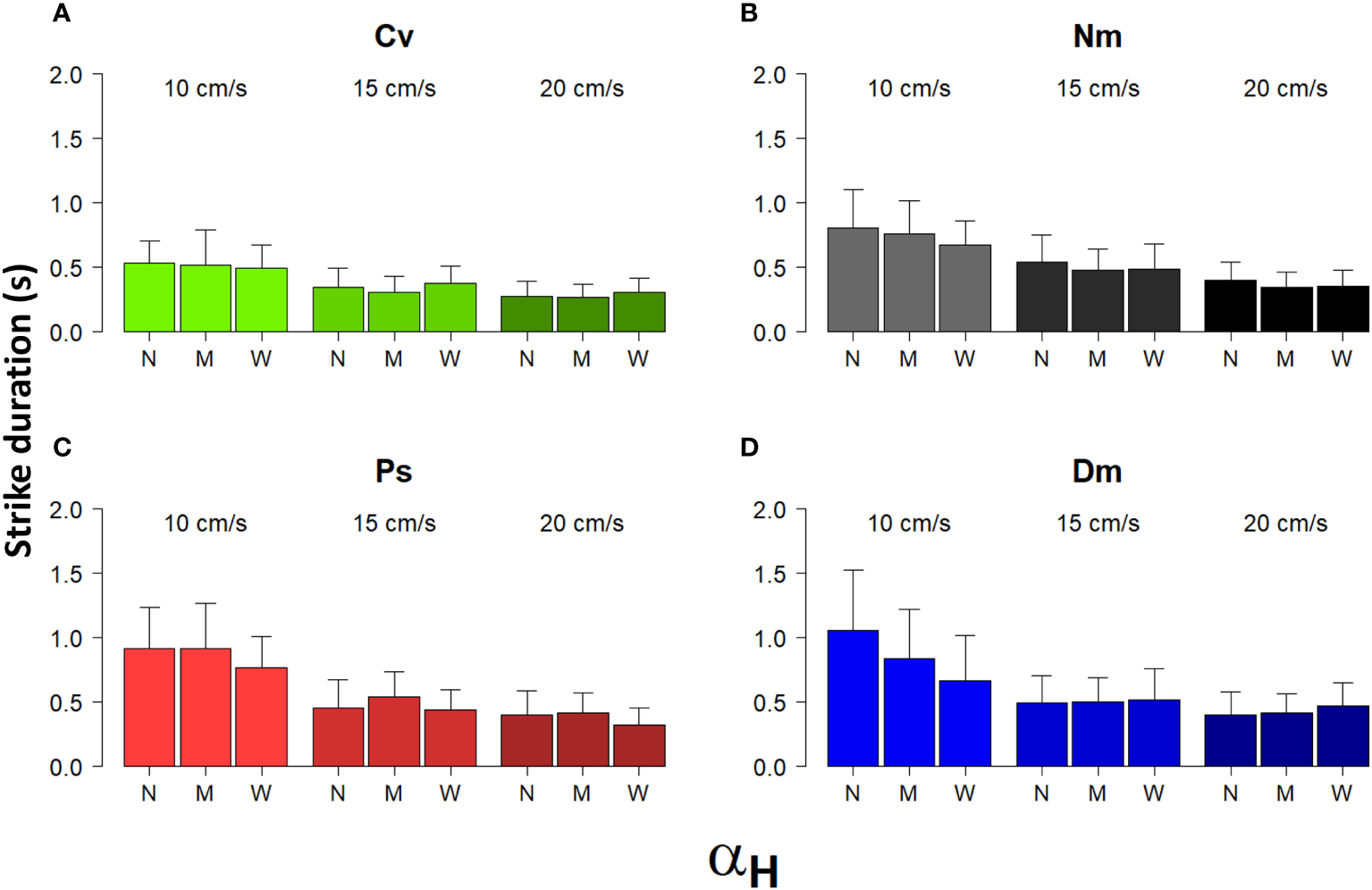 Strike duration vs. αH and flow speed. Shown are the means (± SD) of the duration of strikes performed under different flow speeds (between bar triplicates) in the three different categories of αH: N-narrow, M-mid, and W-wide (within bar triplicates) for the 4 different species (A)-Cv, (B)-Nm, (C)-Ps, and (D)-Dm (color coded as in Figure 1).