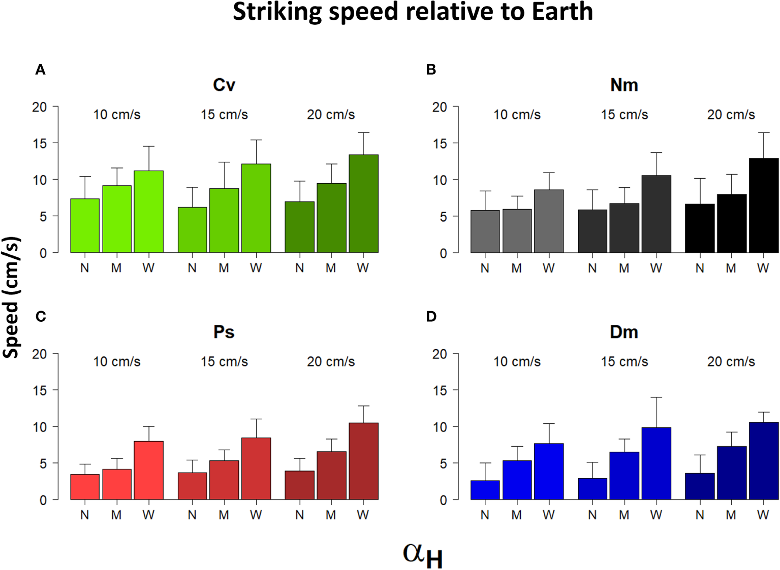 Striking speed relative to Earth vs. αH and flow speed. Shown are the means (± SD) of the speed of strikes in Earth coordinates performed under different flow speeds (between bar triplicates), in the three different categories of αH: N-narrow, M-mid, and W-wide (within bar triplicates) for the 4 different species (A)-Cv, (B)-Nm, (C)-Ps, and (D)-Dm (color coded as in Figure 1).