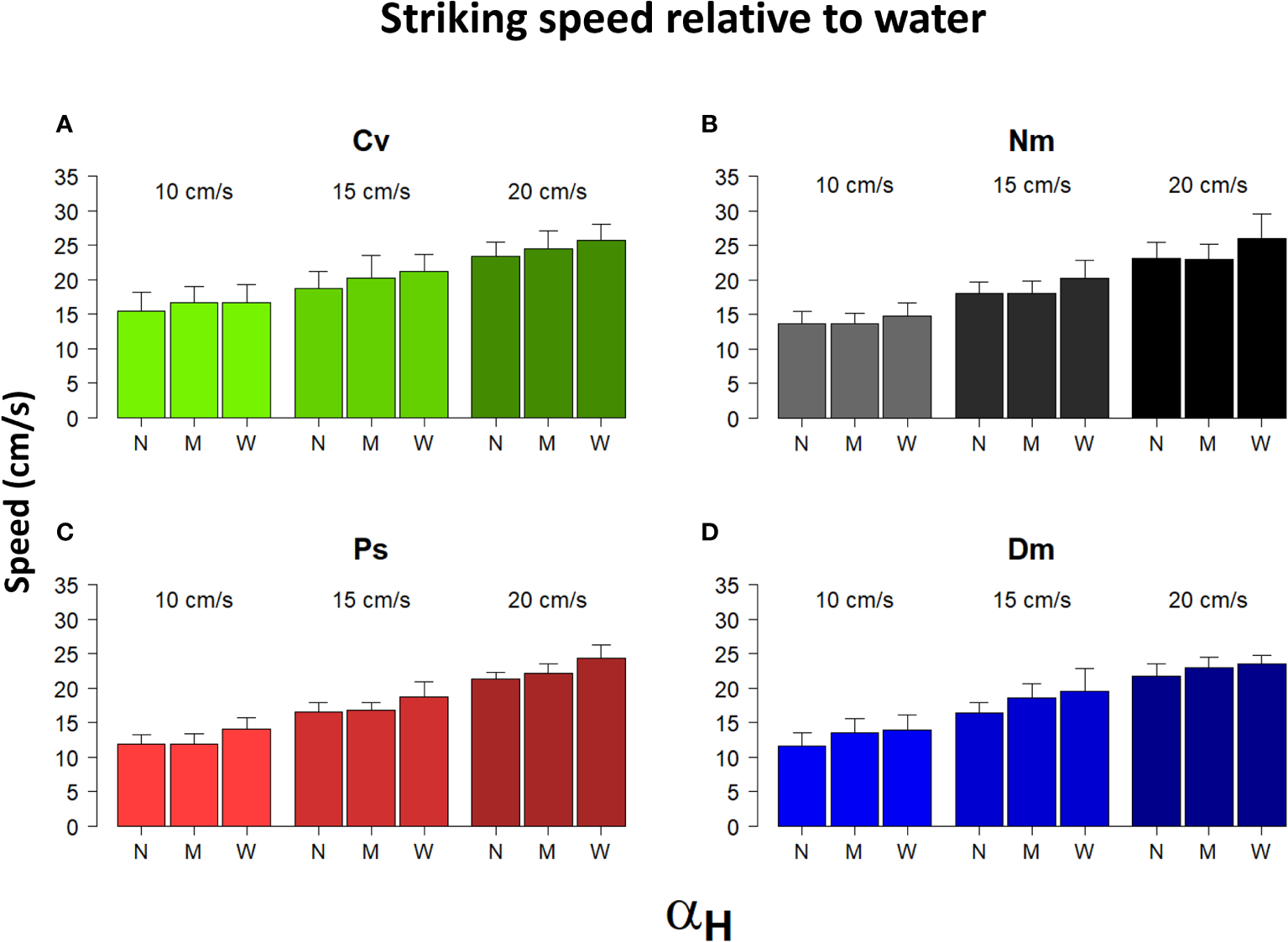 Striking speed relative to water vs. αH and flow speed. Shown are the means (± SD) of the speed of strikes relative to water performed under different flow speeds (between bar triplicates) in the three different categories of αH: N-narrow, M-mid, and W-wide (within bar triplicates) for the 4 different species (A)-Cv, (B)-Nm, (C)-Ps, and (D)-Dm (color coded as in Figure 1).