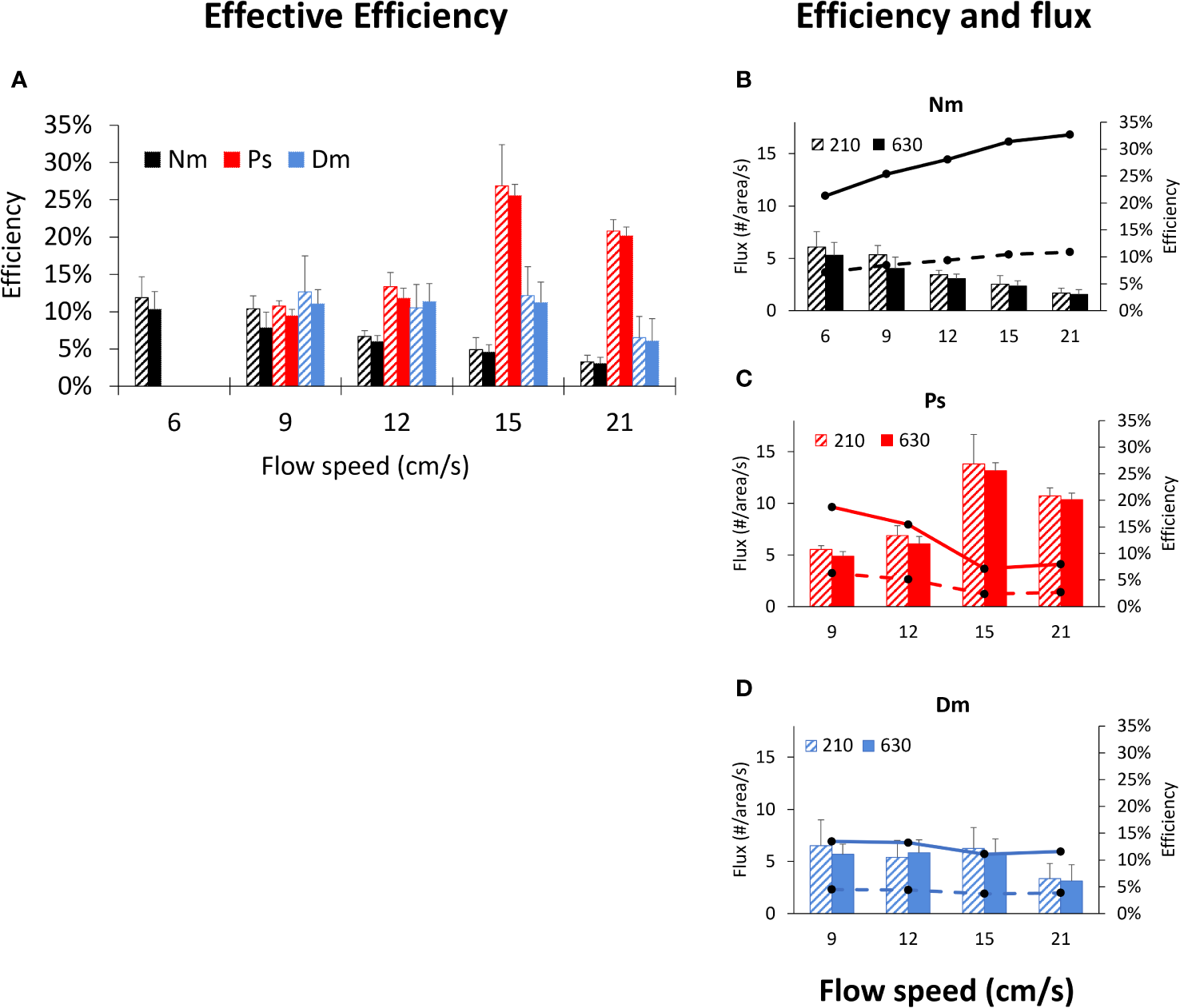 Effective Efficiencies vs. flow speed. (A) - Mean (± SD) Effective Efficiency under different flow speeds for 3 different species (color coded as in Figure 1) under conditions of prey densities of 210 prey m-3 (hatched bars) and 630 prey m-3 (full bars). (B–D): as in (A) with added lines indicating actual prey fluxes under prey densities of 210 prey m-3 (dashed lines) and 630 prey m-3 (full lines). Calculations are based on feeding rates reported by Genin et al. (submitted; see text). The foraging area used to calculate “Effective Efficiencies” and “Actual Fluxes” are taken from our measurements. The distal area of the feeding space, through which potentially-captured prey pass, was calculated as an ellipse in which the longer and shorter axes were twice the maximum horizontal and maximum vertical components of the Reactive Distance, respectively. Since those dimensions were calculated for Dm and Ps at 10, 15, and 20 cm/s (and 5 cm/s for Nm), and since feeding rates were measured by Genin et al. (submitted) at 3, 6, 9, 12, 15, and 21 cm/s, the dimensions measured in this study were linearly interpolated or extrapolated to the flow speeds for which feeding rates are available (Figure 2 in Genin et al., submitted): 9, 12, 15, and 21 cm/s (and 6 cm/s for Nm). The corresponding statistics are reported in Table 1, showing that the effect of flow speed, but not of prey density, was significant and the different species significantly differed one from another.