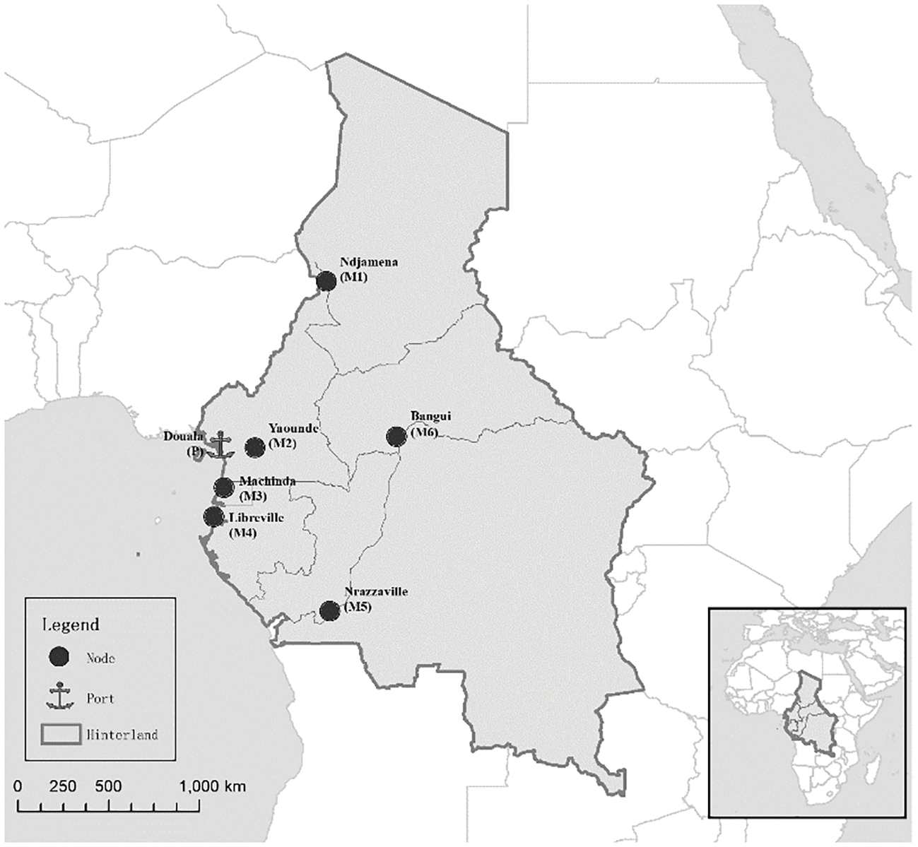 In order to verify the impact of carbon emission factors on the accessibility measurement model, this paper selects the Douala port located in the Gulf of Guinea in Africa as a case for verification. The port of Douala is adjacent to the northwest side of the Gulf of Guinea and is the largest port in Cameroon. Currently, the port of Douala is considering upgrading the collection and distribution system. According to the preliminary investigation, the hinterland of Douala Port mainly includes 6 countries including Chad and the Central African Republic, as shown in Figure 1.
