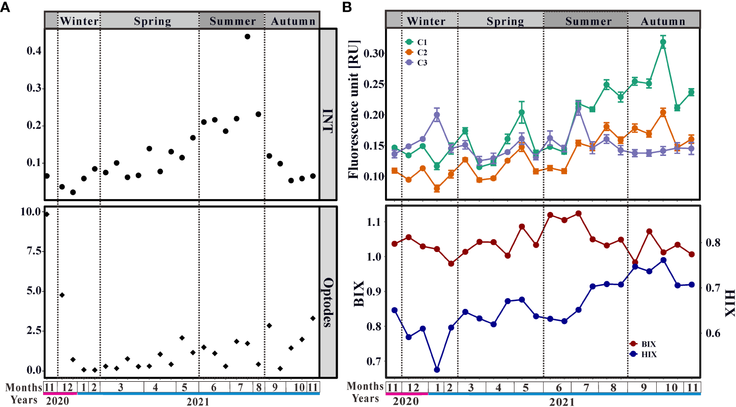 The PARAFAC model decomposed three components (C1, C2, and C3), which were statistically validated using the split-half validation (Supplementary Figure4). These components were confirmed with the OpenFluor database (Murphy et al., 2014). C1 (Maxex/em=250(310)/398 nm) and C2 (Maxex/em=250(360)/480 nm) were characterized as humic-like components, and C3 (Maxex/em=275/323 nm) exhibited protein-like component properties. C1 and C2 had similar variations in that fluorescence intensity increased over time and peaked in autumn (Figure 1B). In contrast, the fluctuation of C3 was more slight and a peak appeared in winter (Figure 1B). Besides, HIX increased with time and peaked in autumn. These results indicated that refractory humic-like components accumulated in autumn. The differences in BIX in winter, spring, and autumn were slight, and BIX in summer was higher than in other seasons (Figure 1B).
