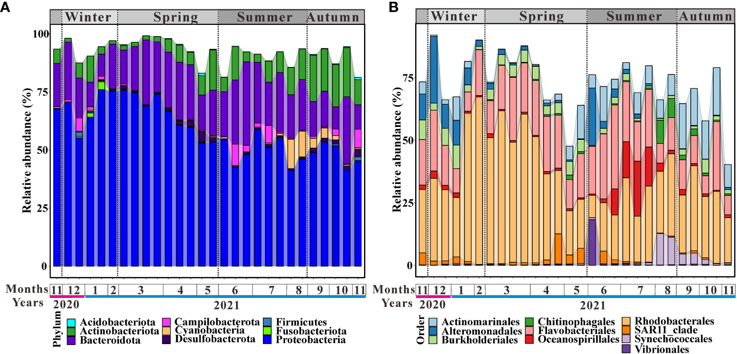 Rhodobacterales (33%), Flavobacteriales (18%), Actinomarinales (6%), and Alteromonadales (4%) were predominant throughout the year at the order level (Figure 2B). Oceanospirillales were significantly higher in summer than in other seasons and the same was true for Chitinophagales and Vibrionales (Figure 2B). Actinomarinales accounted for a larger proportion in autumn than in other seasons (Figure 2B). Alteromonadales were higher in winter and summer than in spring and autumn (Figure 2B). As for Burkholderiales, the relative abundance was higher in the first (winter and spring) half of the year than in the second (summer and autumn) half (Figure 2B). SAR11_clade was clearly higher in later spring than in other periods (Figure 2B). Similar to Cyanobacteria, the bloom of synechococcales appeared in late summer and decreased with time (Figure 2B).