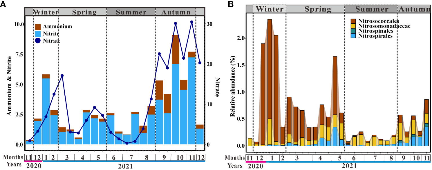Dissolved inorganic nitrogen (DIN) concentration changed along with the seasons (Figure 3A). Ammonium, nitrite, and nitrate were highest in autumn as compared to the rest of the year (Figure 3A). The concentration of ammonium changed little, being low before August and then increasing, causing ammonium accumulation in autumn (Figure 3A). Although the concentration of nitrite fluctuated with each month, it was higher in autumn than in other seasons (Figure 3A). Nitrate concentration increased in winter and early spring, but then dropped, with the lowest value appearing in summer (Figure 3A). The concentration of nitrate increased from July onward, peaking in autumn (Figure 3A). Nitrifiers were widespread in the coastal ocean and four species were found in Aoshan Bay (Figure 3B). In winter and spring, ammonium-oxidizing bacteria (AOB) belonging to Nitrosococcales were clearly dominant (Figure 3B). Nitrosomonadaceae, another group affiliated to AOB, dominated the nitrifying bacteria in summer (Figure 3B). Nitrite-oxidizing bacteria (NOB), Nitrospinales and Nitrospirales, were higher in autumn than in other seasons (Figure 3B). Bloom of Nitrospirales was also observed in the second half of spring (Figure 3B). In summary, AOB was the dominant nitrifier in Aoshan Bay except in autumn, during which the relative abundance of AOB was not clearly higher than that of NOB (Figure 3B).