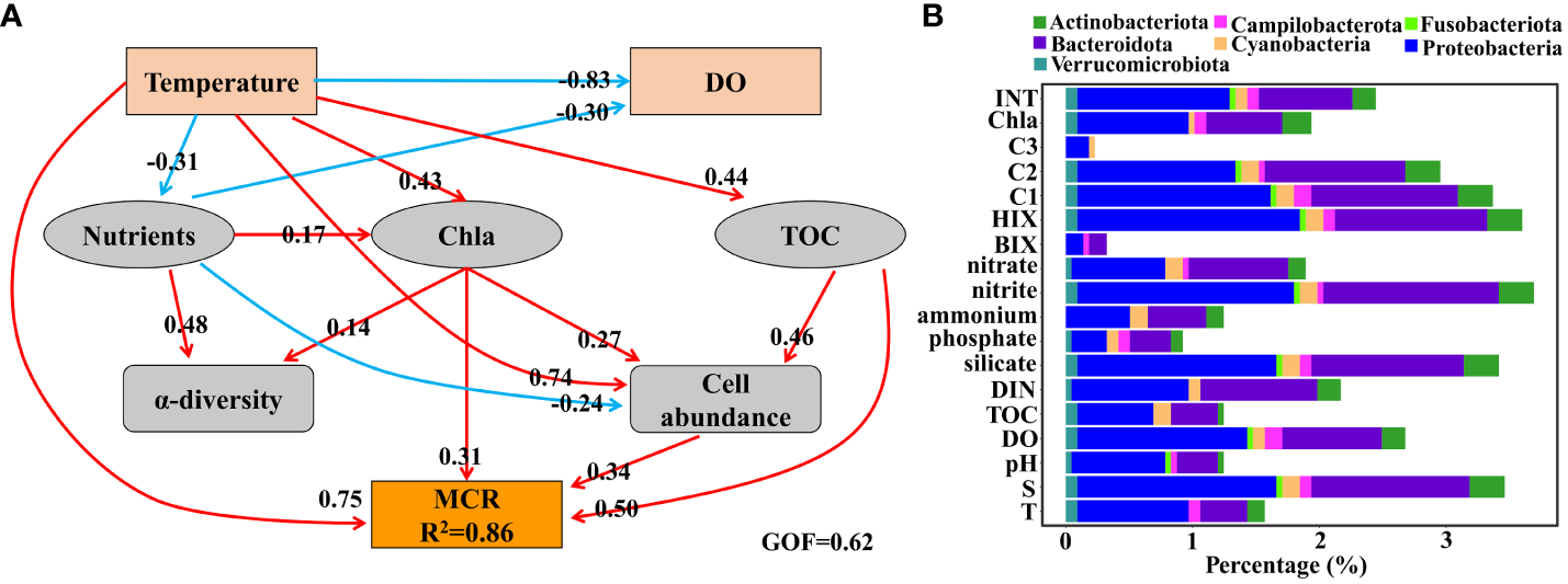 (A) Partial least squares path analysis for microbial community respiration (MCR), showing the relationships between selected physical-chemical parameters, characteristics of microbes, and MCR. GOF, goodness of fit; DO, dissolved oxygen; TOC, total organic carbon; Chl a, chlorophyll (a) Red and blue lines represent positive and negative correlations, respectively. For simplicity, only effects that were not less than 0.1 are shown in the plot. Meanwhile, the effects of oxygen on other parameters are also not shown in the plot as a result of no hypoxia in the sampling field. (B) The percentage of ASVs significantly correlated with various environmental parameters (based on maximal information coefficient). Information on the taxonomy of ASVs is shown in different colors.
