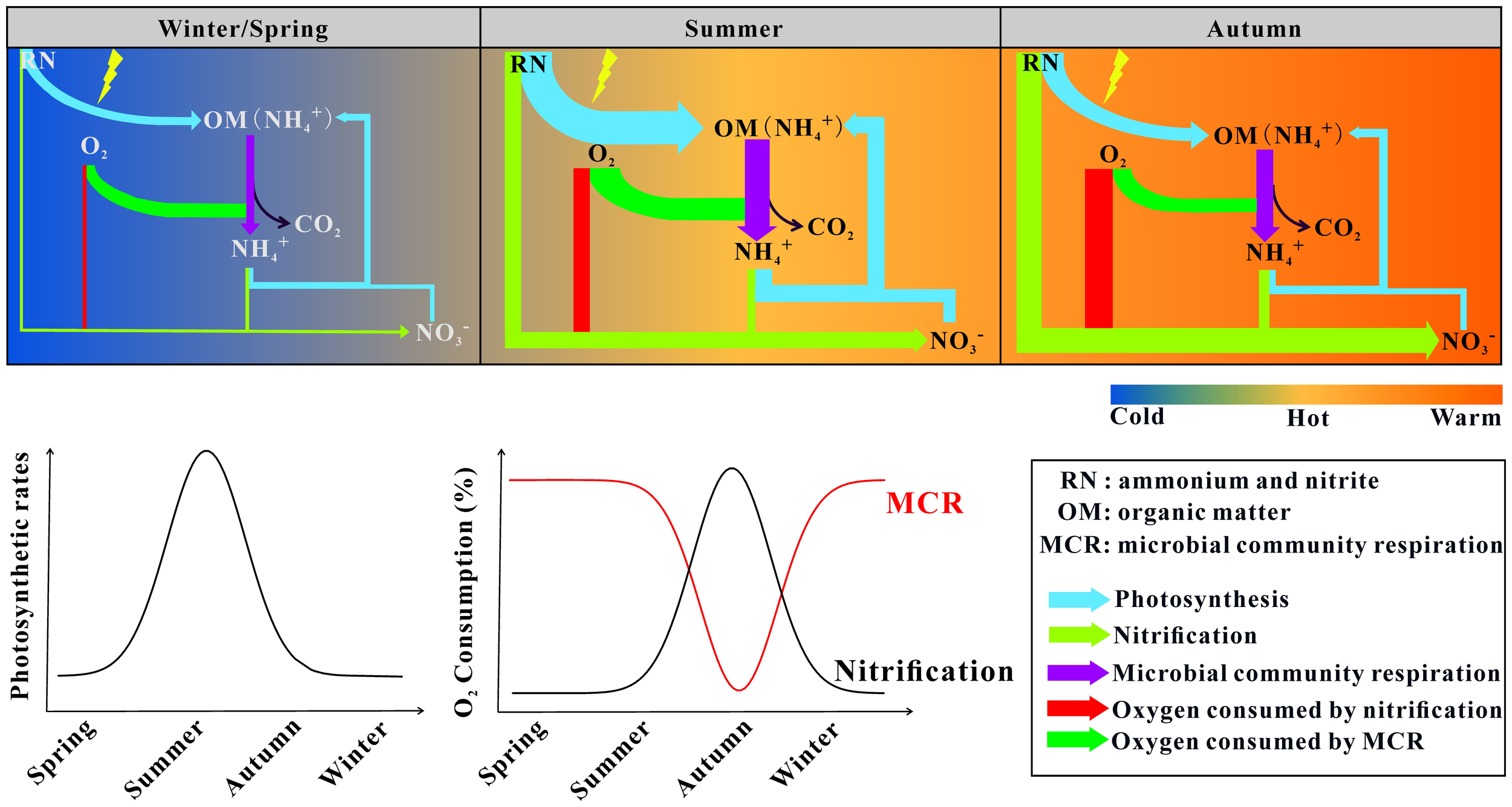 | Major biogeochemical processes involved in oxygen consumption. The width of the arrows represents the flux of nitrogen and oxygen.