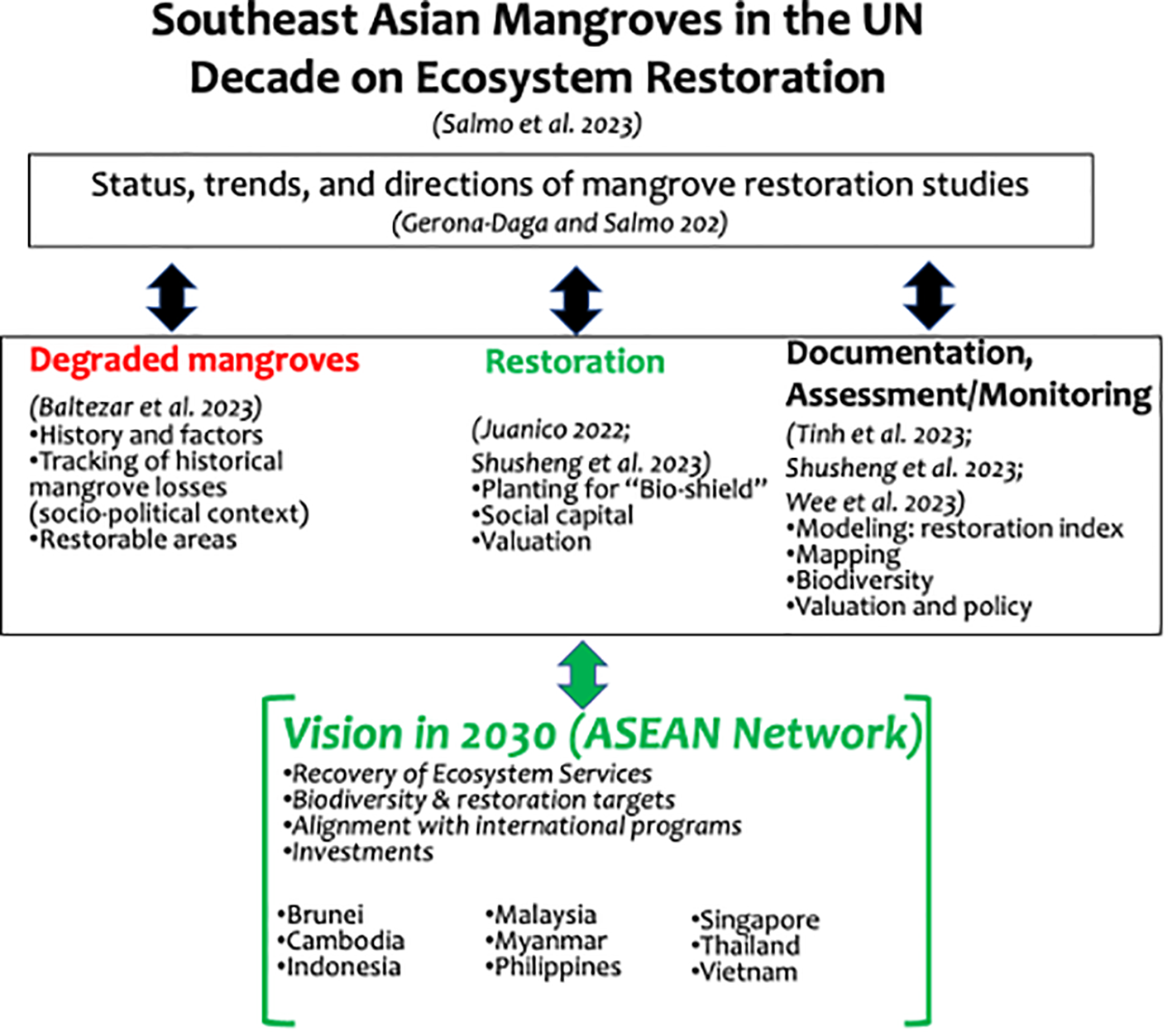 Most of the mangrove restoration studies in the region were conducted in response to problems associated with conversion to aquaculture, coastal erosion, and natural disasters. Different countries have different foci based on national problems and priorities (Gerona-Daga and Salmo). A systematic assessment of impacts of restoration programs are rarely reported. Out of the available reports, the most commonly reported impacts are ecosystem functions that are directly related to the recovery of ecosystem services primarily “awareness” and “livelihood”, but not the other equally important ecosystem functions. Research topics suggested in this study provide a path forward to improve mangrove restoration, and aid in the development of national and international restoration and conservation strategies. The authors further suggested that an international network among SE Asian scientists through the Association of Southeast Asian Nations (ASEAN) should be facilitated to come up with a more strategic mangrove research and management program.