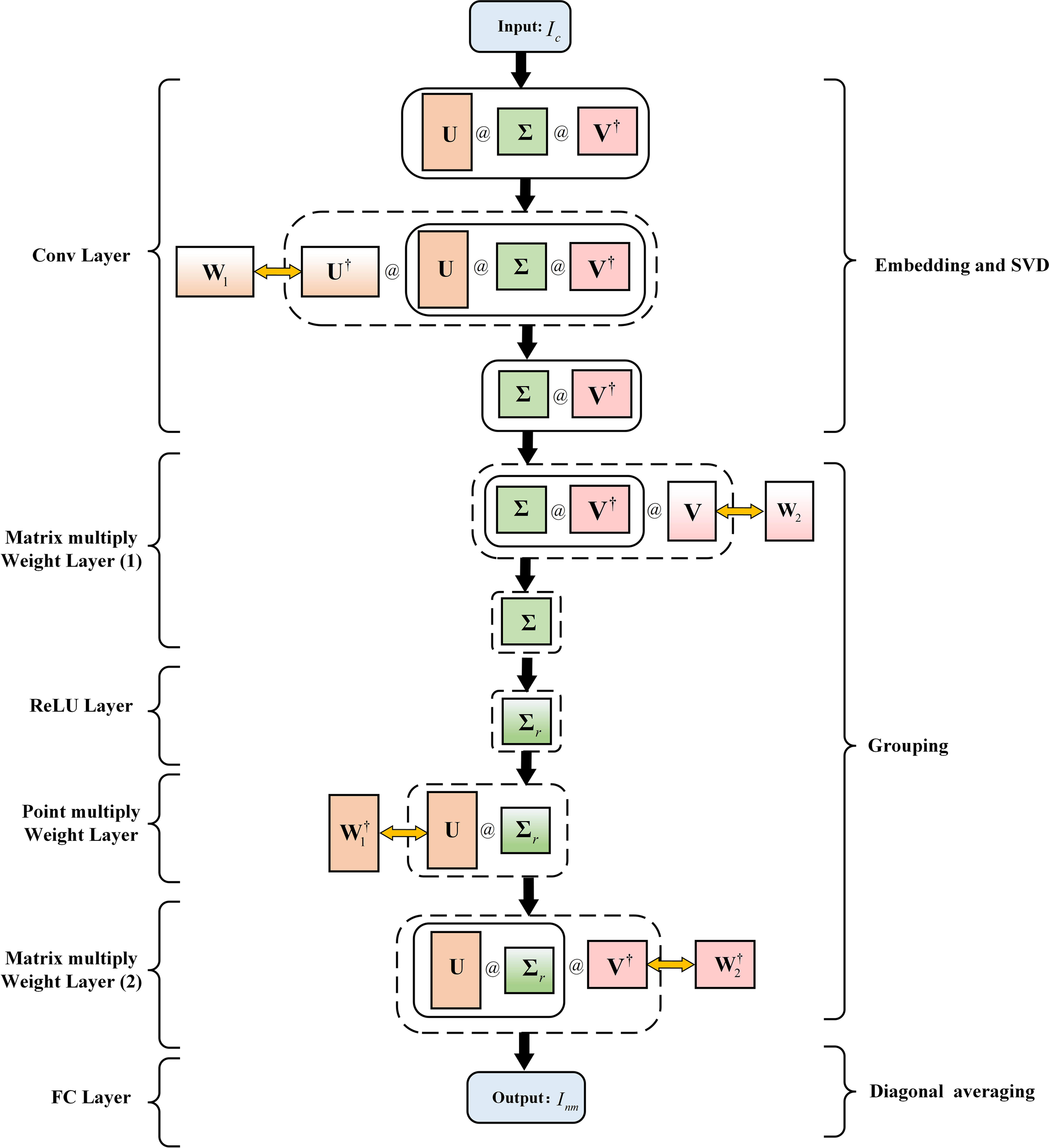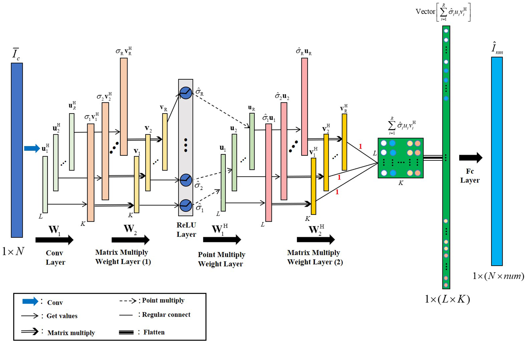 where y′ and y′′ represent the input and output, respectively, of the convolutional neural layer. Ker is the convolution kernel, (1,v) is the coordinate of Ker, (1,e) is the coordinate of the output vector, and b1 is the bias. Therefore, b1 can be initialized to 0, and the above process uses a convolution network implementation. The weight parameter W1 of the convolutional network corresponds to U†. The channel number of the convolutional network is equal to the number of rows (R) in matrix U†, and the size of the Ker is equal to the number of columns (L) in U†. The output of this convolution operation is equal to matrix ΣV†. This layer is called the convolutional layer (Conv Layer);