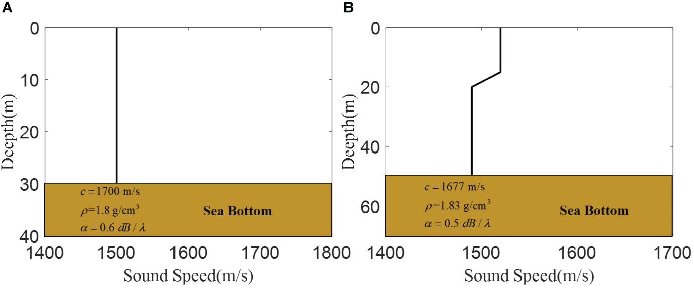 The sound speed and medium parameters. (A) Is the isovelocity waveguide sound speed profiles. (B) Is the thermocline waveguide sound speed profiles.