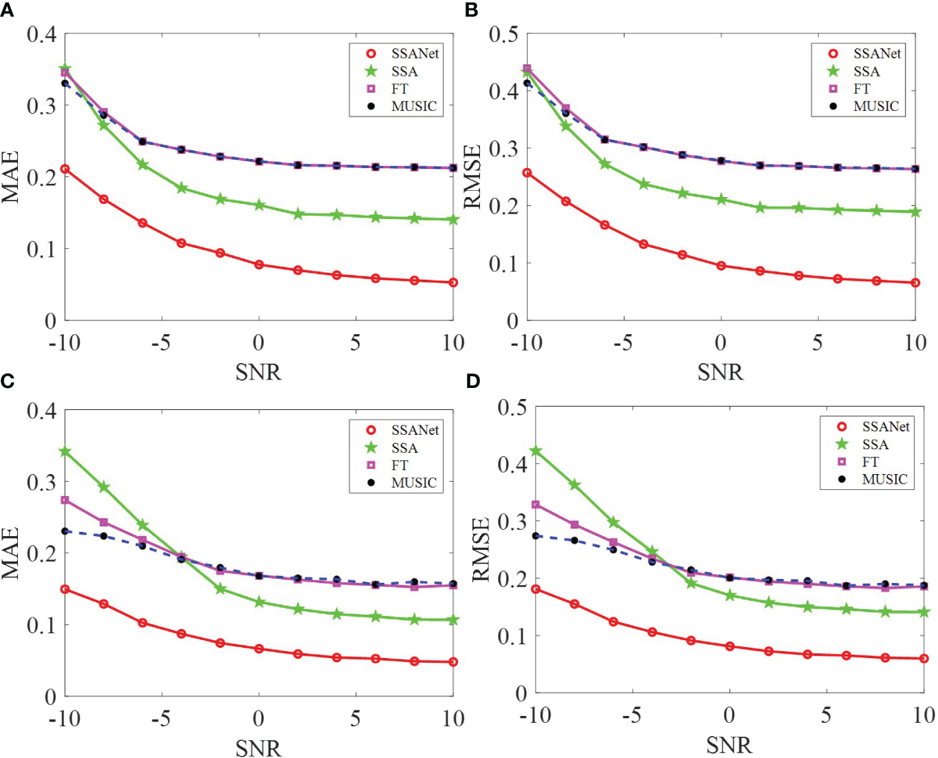 From Figures 5, 6, 8, 9, it can be observed that SSANet provides the overall best extraction results for the phase, amplitude, and oscillation period of the NMIS. However, the FT, MUSIC, and SSA methods exhibit a significant decrease in performance when the amplitude and phase of the NMIS exhibit nonlinear variations with frequency under low SNR conditions. This is because the traditional extraction algorithms are designed by analyzing the physical processes and through handcrafting, while SSANet attempts to automatically discover model information and incorporate NMIS information by optimizing network parameters that are obtained from the training samples (Monga et al., 2021). On the one hand, when there is noise, traditional extraction algorithms do not consider the prior information of the noise, whereas SSANet learns the prior information of the noise during network training, and thus SSANet has stronger noise robustness. On the other hand, when the amplitude and phase of the NMIS exhibit nonlinear changes, the prior assumption of traditional extraction algorithms makes it difficult to extract nonlinear information. The SSANet can learn nonlinear information through training. Overall, it can be said that the trained SSANet is a parameter-optimized version of the SSA algorithm and therefore outperforms traditional extraction algorithms. These results confirm the effectiveness of the SSANet proposed in this study.