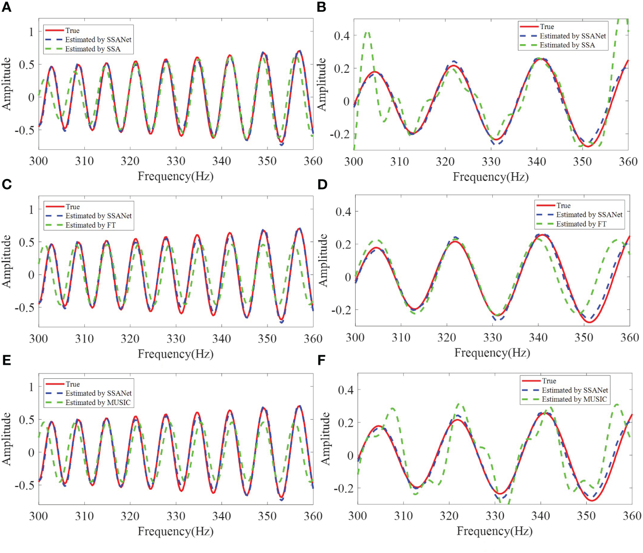 The SSANet extracts I13 result comparing with (A) SSA, (C) FT, and (E) MUSIC from Figure 7B. The SSANet extracts I12 result comparing with (B) SSA, (D) FT, and (F) MUSIC from Figure 7B.
