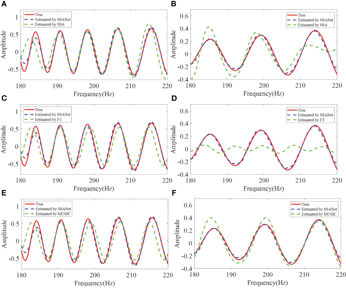 The SSANet extracts I13 result comparing with (A) SSA, (C) FT, and (E) MUSIC from Figure 7A. The SSANet extracts I12 result comparing with (B) SSA, (D) FT, and (F) MUSIC from Figure 7A.