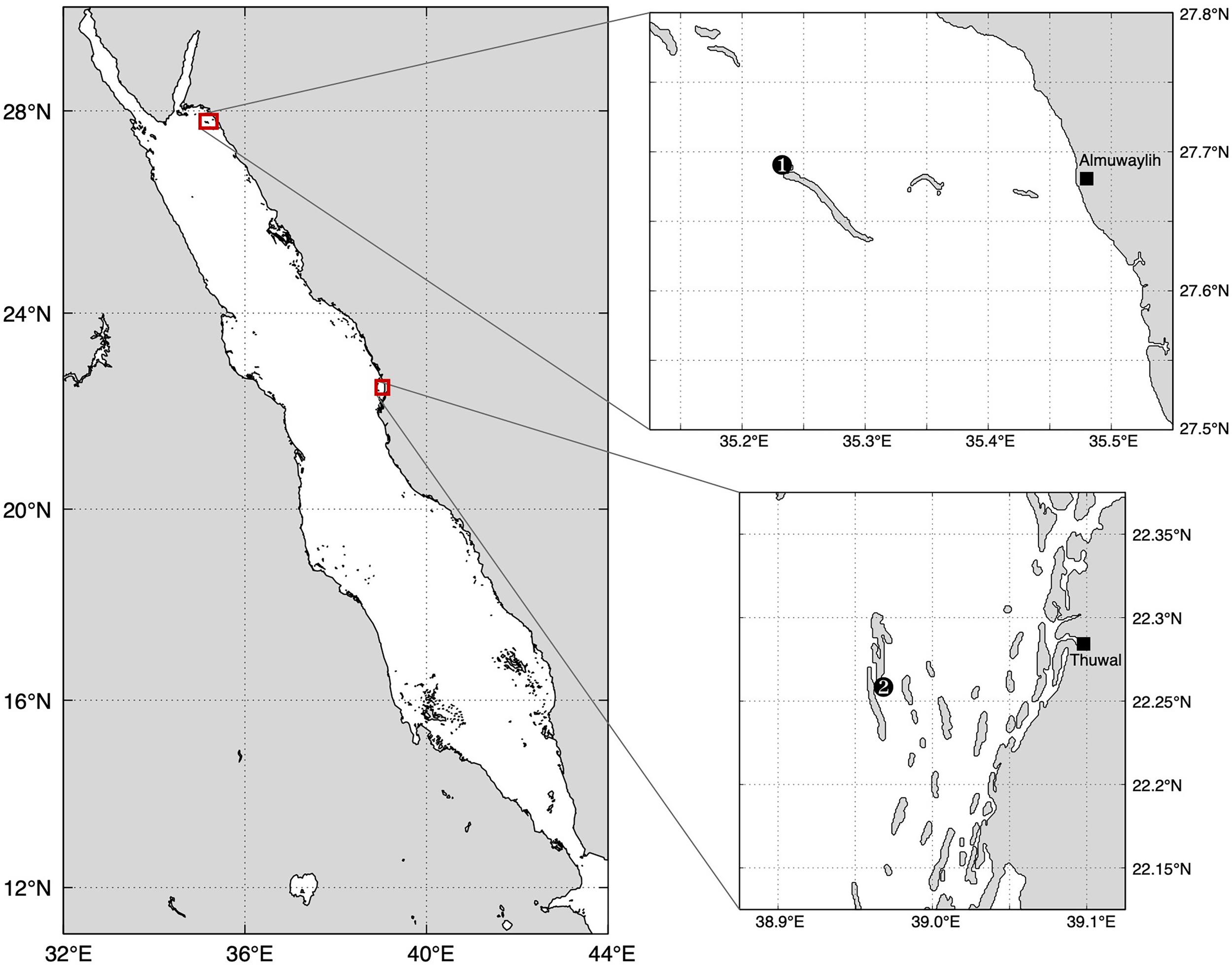 Red Sea map indicating the study locations of the Stylophora pistillata experiment (1) in the northern Red Sea, and study site of the Pocillopora verrucosa experiment in the central Red Sea (2).