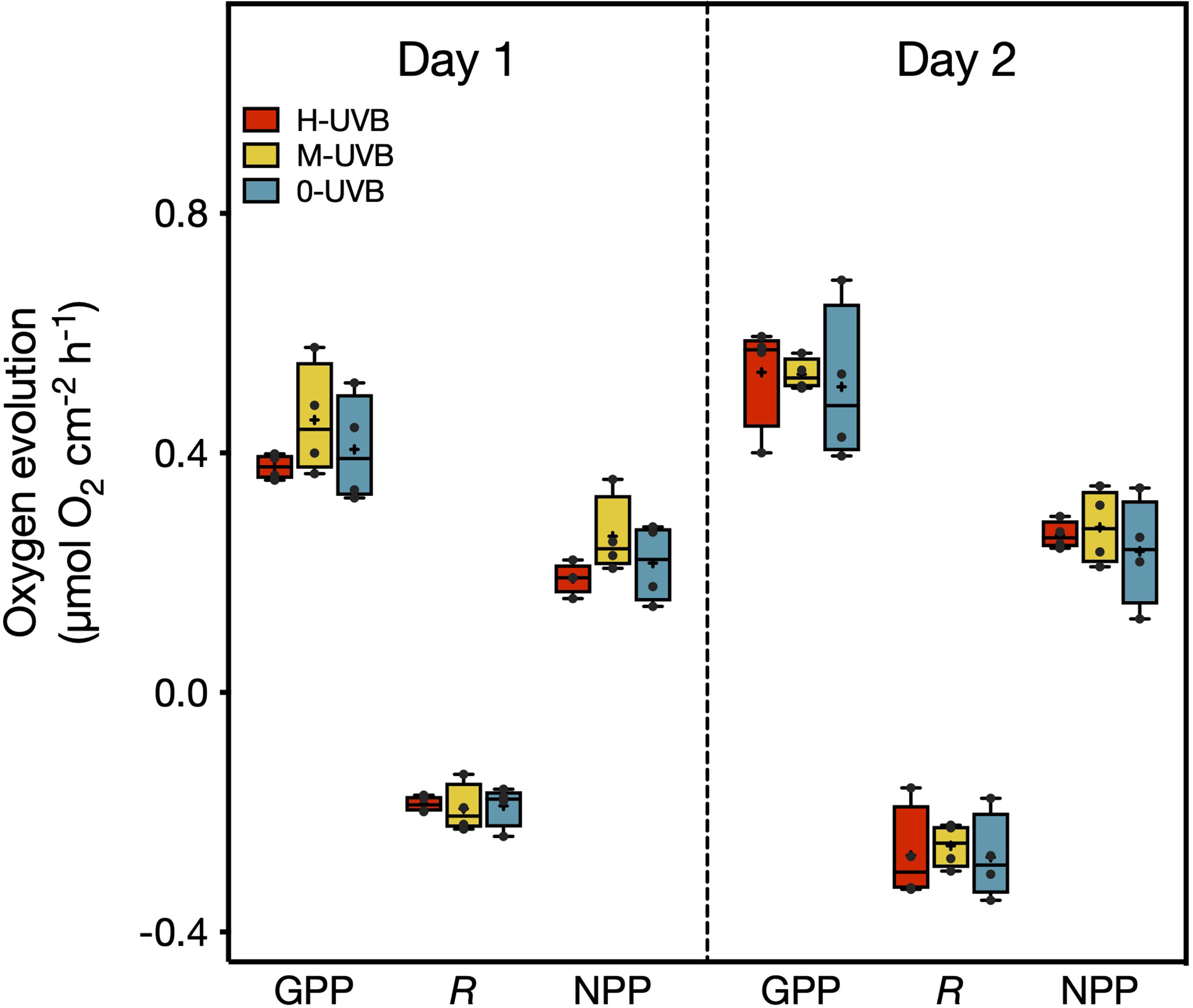 Oxygen evolution/consumption (µmol O2 cm-2 h-1) measured during the incubations as part of the Stylophora pistillata experiment on 6th (Day 1) and 7th October 2016 (Day 2). Displayed are the gross primary production (GPP), respiration (R), and net primary production (NPP). Samples were incubated in either full UVB (red), medium UVB (yellow), or under UVB-removal (blue) conditions. Horizontal lines inside the boxplots indicate median values, and crosses the means. Black dots represent individual data points. One-way ANOVAs and subsequent Tukey’s post hoc tests identified no significant differences (p < 0.05) between treatments for any of the three parameters on either day.
