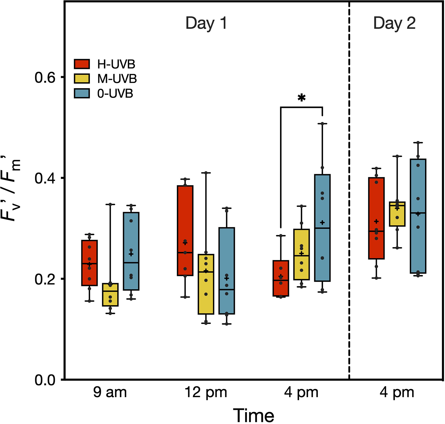 Effective quantum yield (Fv’/Fm’) of Stylophora pistillata fragments, measured during the experiment on 6th (Day 1) and 7th October 2016 (Day 2). Coral fragments were incubated in either full UVB (red), medium UVB (yellow), or UVB removal (blue) conditions. Boxplots indicate 95% CIs. The horizontal lines inside the boxplots represent medians, while crosses indicate means (n=8). Tukey’s pairwise comparison results are shown above boxplots (* indicates p < 0.05).