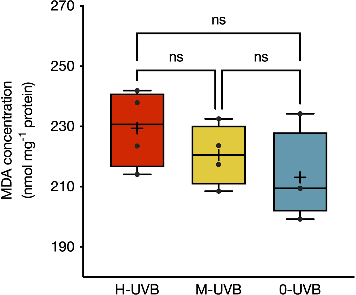 MDA concentrations (in nmol mg-1 protein) in Stylophora pistillata fragments at the end of the experiment performed on 6–7th October 2016. Coral fragments were incubated in either full UVB (red), medium UVB (yellow), or UVB removal (blue) conditions. Boxplots indicate 95% CIs. Horizontal lines inside the boxplots represent medians, while crosses indicate means (n=4). Tukey’s pairwise comparison results are indicated above boxplots (ns = non-significant).