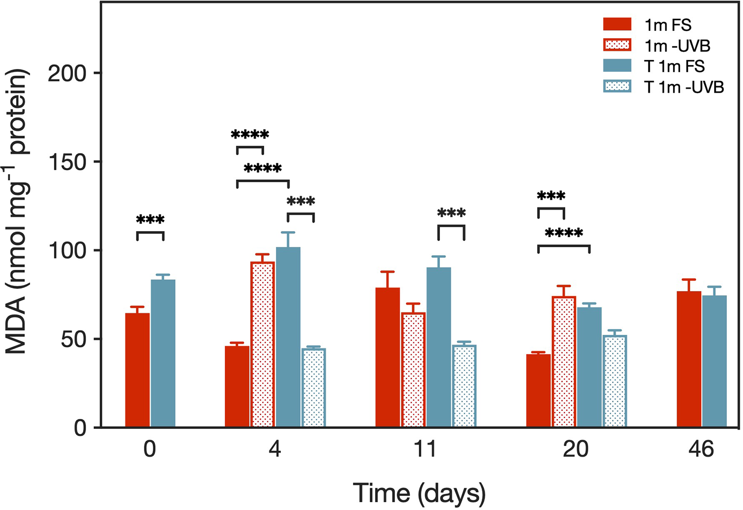 At the start of the experiment and after 4, 11, and 20 days, 12 coral fragments per treatment (1m FS, 1m -UVB, T 1m FS, T 1m -UVB) were collected, plus an additional 12 fragments from the two FS groups after 46 days. The samples were shock-frozen in liquid nitrogen and stored at -80°C until further analysis of lipid peroxidation and total protein content (see 2.6.).