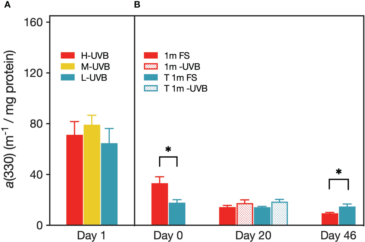 Most of the existing studies that aimed to elucidate the ecological effects of UVB have examined the stress responses of corals in the laboratory using artificially supplied PAR and UVB without providing UVA (315–400 nm), despite the latter being known to have beneficial effects (Häder et al., 2015). The few in situ studies mostly tested stress responses of corals following upward transplantations without any additional manipulation of the light conditions, which makes it challenging to disentangle the impacts of increased UVB from those of increased PAR and UVA. Upward transplanted corals exhibited reduced fecundity, symbiosis breakdown, or died within 20 days of transplantation (Vareschi and Fricke, 1986; Richier et al., 2008; Torres et al., 2008; Cohen et al., 2013).