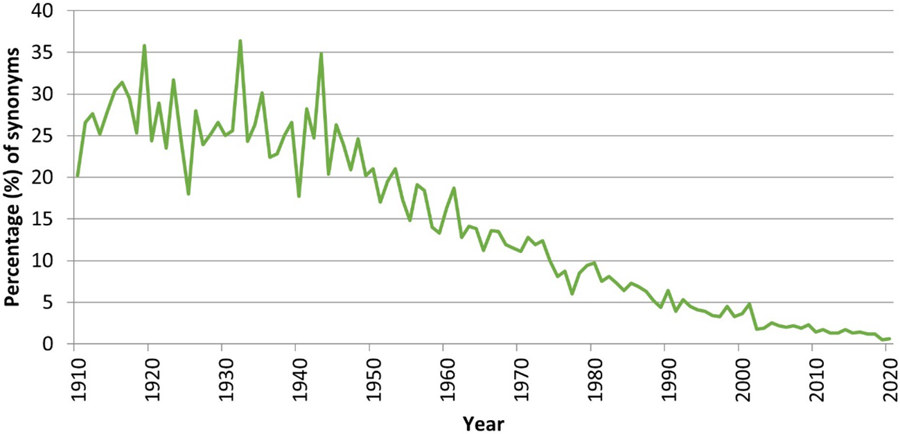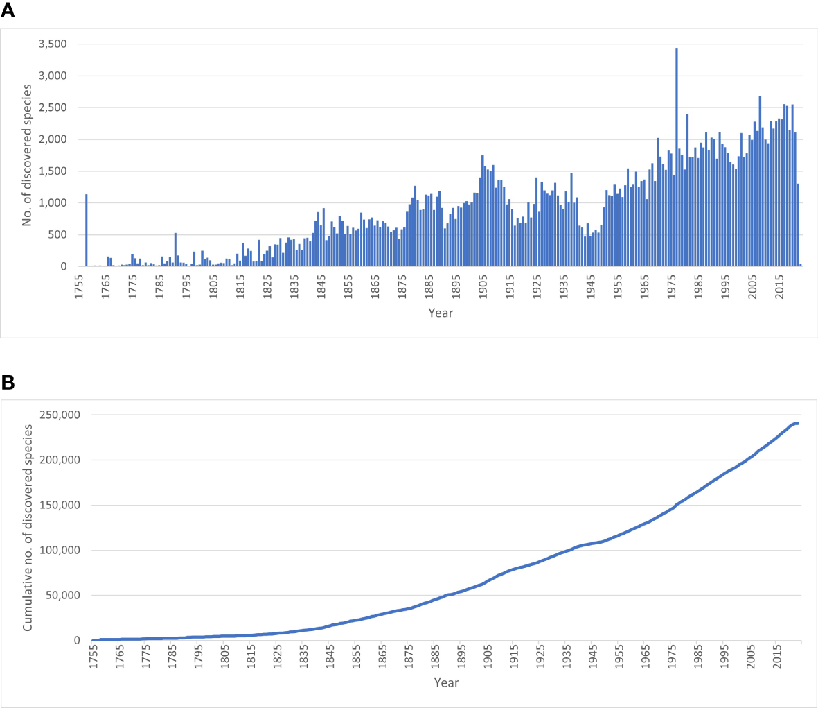 Whether or not the call for accelerating the exploration of marine biodiversity (e.g., Anonymous, 2022; Rogers et al., 2022) will actually have tangible effects in the next decade in terms of species descriptions will at best remain an expert opinion unless we have a baseline to measure current marine species discovery. There are currently c. 242,000 valid marine species known to live in the world oceans (WoRMS, 2023; Table 1). Figure 1A demonstrates a dip in species descriptions during the World Wars and two clear peak years—1758, when Linnaeus published the 10th edition of his Systema Naturae, and 1977, when a single publication described over 1,700 new species of marine Foraminifera (McCulloch, 1977)—and there is no sign that species discovery is reaching an asymptote (Figure 1B): biota continue to be discovered and named steadily at a current average of 2,332 new species per year (see further down), with total number of known and unknown projected to be anywhere from 0.3 million (Costello et al., 2012; Costello, 2014) to 2.2 million species (Mora et al., 2011). However, there does not currently exist detailed metrics of marine species discovery and their taxonomic descriptions in the scientific literature.