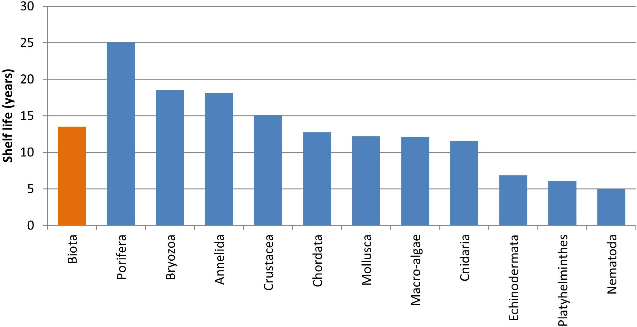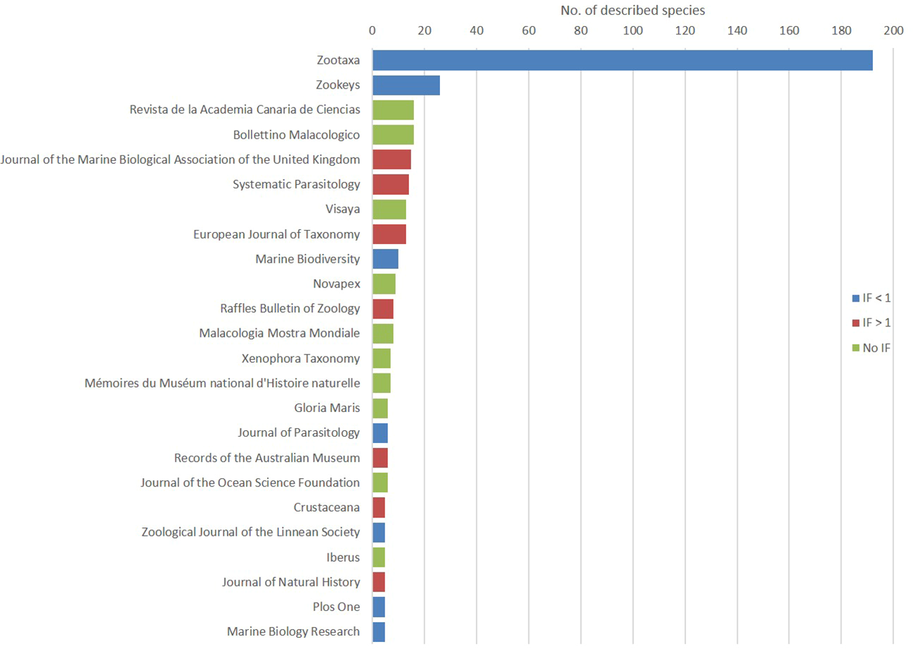 Based on the World Register of Marine Species (WoRMS), there are currently c. 242,000 known valid marine species living in the world's oceans and marine biota continue to be discovered and named steadily at a current average of 2,332 new species per year. The “average” newly described marine species is a benthic crustacean, annelid, or mollusc between 2 and 10 mm in size, living in the tropics at depths of 0–60 m, and represented in the description by 7–19 specimens. It is described after a shelf life of 13.5 years in an article with two to three authors in a journal with an IF <1, published by an academic institution or society or a small commercial publisher. It is highly likely that the description is not accompanied by molecular data and that its authors do not work in an institution in a region of the world where the new species comes from. At the current pace of discovery and characterization, it will take several hundred years to describe the remaining 1–2 million unknown marine species. With increased facilitation of access to literature, marine taxonomy will increasingly rely on retired professionals and citizen scientists. The barriers to new marine species descriptions are in part technological (access to habitats that are difficult to sample) and educational (training to generate and use molecular barcodes), but mostly institutional (funding of taxonomic work) and regulatory (restrictions imposed by access and benefit sharing legislation).