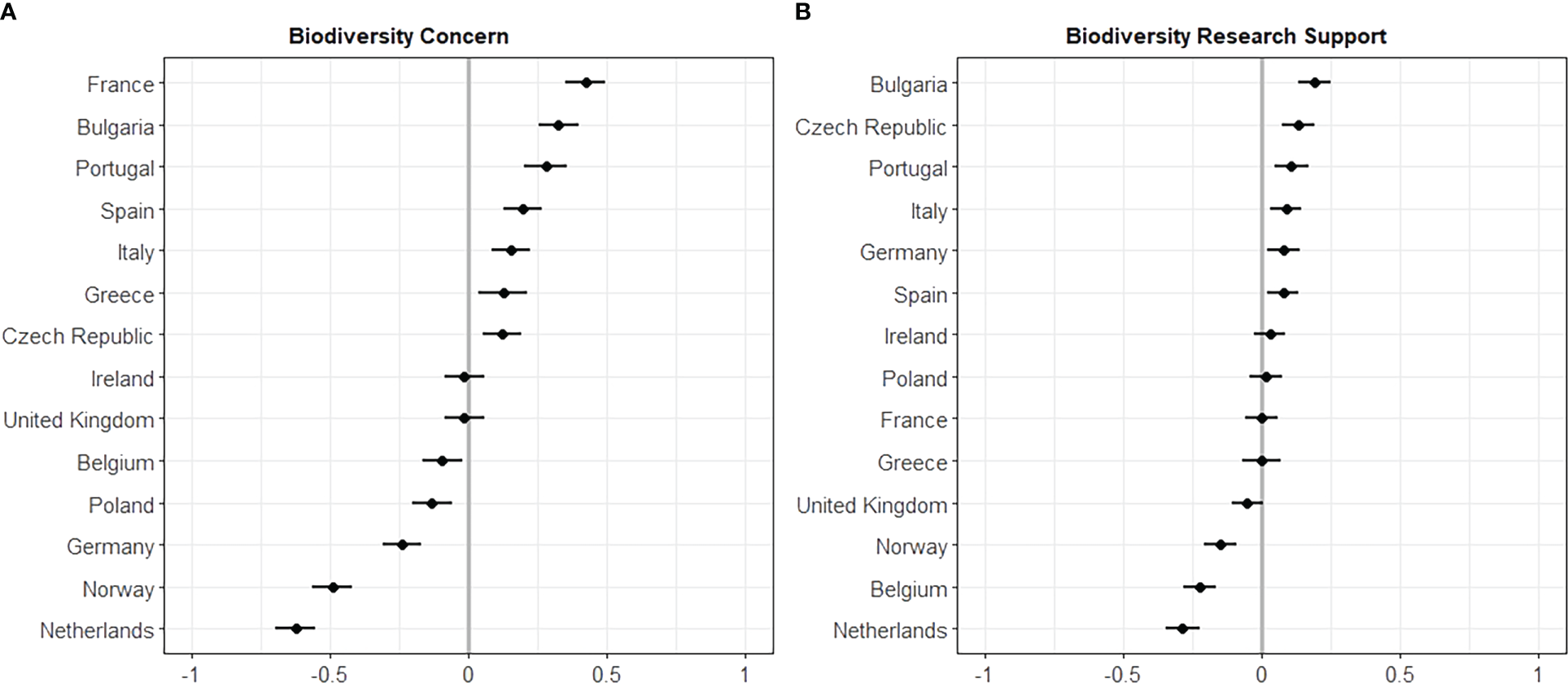Country-level intercepts (ranked from highest to lowest in each case) from final models predicting health-related concern for (A) marine species loss (Biodiversity Concern Model 1), and (B) support for health-related research funding into marine species protection (Biodiversity Research Model 2). Scores for each country represent divergence from the grand mean (with 95% confidence intervals) across all countries, and not absolute scores (so France was significantly above average for concern, whereas Netherlands was significantly below average).