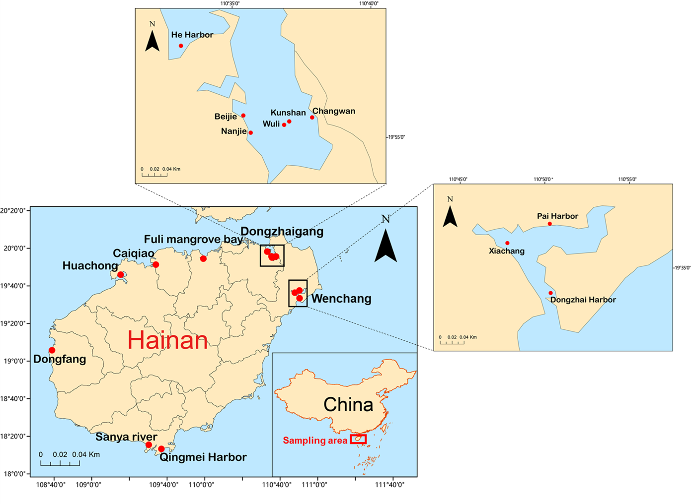 Mangrove forests are saline and tidal habitats and are considered one of the most carbon-dense ecosystems on Earth (Bai et al., 2021). Mangrove wetlands provide numerous ecological services and functions, including water purification, coastal protection, and marine animal habitats (Lovelock and Duarte, 2019). Several studies have reported the distribution of MPs in global mangrove forests. Li et al. (2018) found that the abundance of MPs ranged from 15 to 12,852 items/kg in sandy beaches and mangrove wetlands. The average abundance of MPs in mangrove sediments in Singapore was 9.2 ± 5.9 particles/250 g (Mohamed Nor and Obbard, 2014) and varied from 0.6 to 8.0 items/individual in fish species collected from the mangrove wetland of Zhanjiang (Huang et al., 2020). In addition, Zhou et al. (2020) investigated the distribution of MPs along the coast of China and found that the abundance of MPs in mangrove sediments was 8.5 times higher than that in mangrove-free sediments. Nevertheless, in the Muara Angke Wildlife Reserve of Indonesia, the concentrations of MPs in sediments were higher outside than inside mangrove areas (Cordova et al., 2021). However, few studies have focused on MP pollution in benthic species, especially invertebrates, in mangrove wetlands. Hainan Island represents nearly 20% of the mangrove forest areas in China, and these areas are distributed in Dongfang, Danzhou, Lingao, Chengmai, Dongzhaigang, Wenchang, and Sanya. Among them, the Dongzhaigang National Mangrove Reserve, which was established in 1986, was designated as one of the most important wetlands in the world in 1992 (Qiu et al., 2011; Wu et al., 2013).