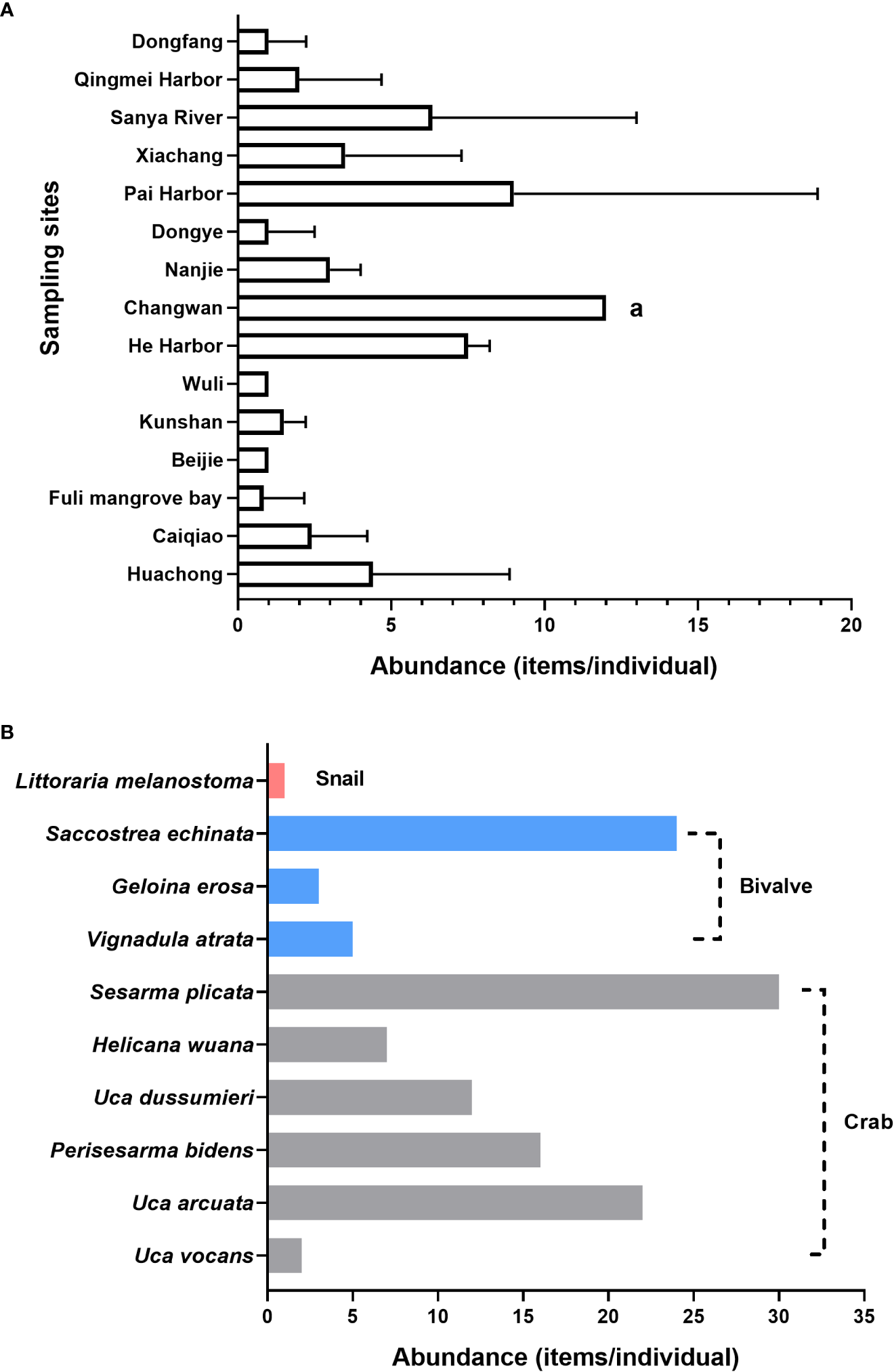 Microplastic abundance in the different sample sites (A) and in each benthic species (B) from the mangrove areas of Hainan. Lowercase letter "a" indicate significant differences between sampling sites.