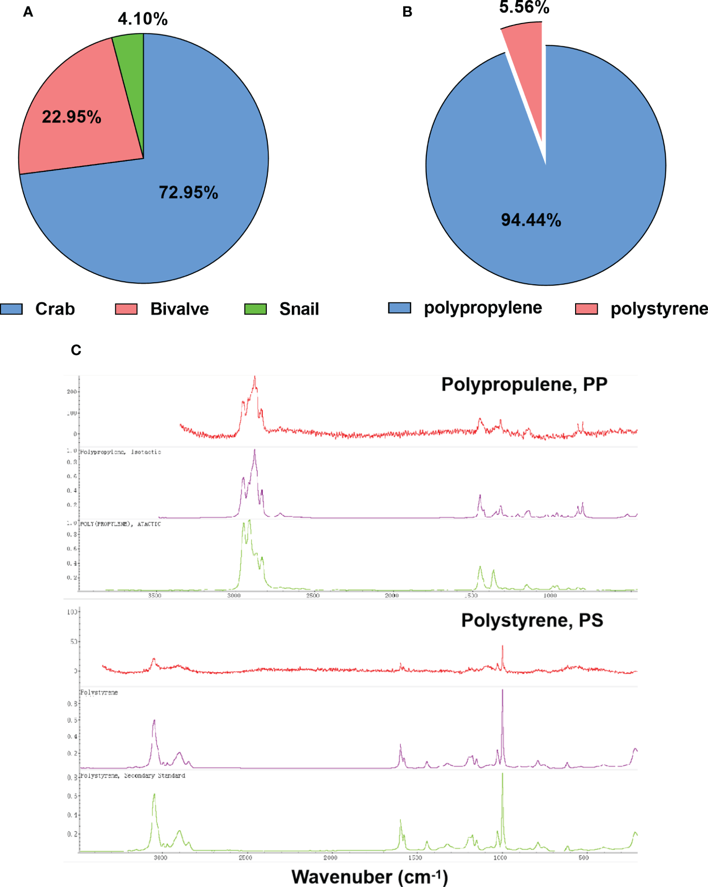 The MPs were extracted as described by Munno et al. (2018), with some modifications. Briefly, the soft tissues of animals (crabs, bivalves, and snails) were collected and weighed and then placed in 500-ml glass beakers individually. Subsequently, 180 ml of 10% (m/v) KOH and 20 ml of 30% H2O2 were added for the digestion process. Each beaker was covered with aluminum foil and placed in an oven at 60°CC for at least 48 h. To ensure complete digestion, the beaker was shaken every 6 h. The digestate was then cooled and vacuum filtered through a GF/F glass microfiber filter (0.7 mm pore size, 47 mm diameter; Whatman plc, Maidstone, UK). Afterward, the filters were placed in clean Petri dishes and dried at room temperature (25°CC) until analysis.