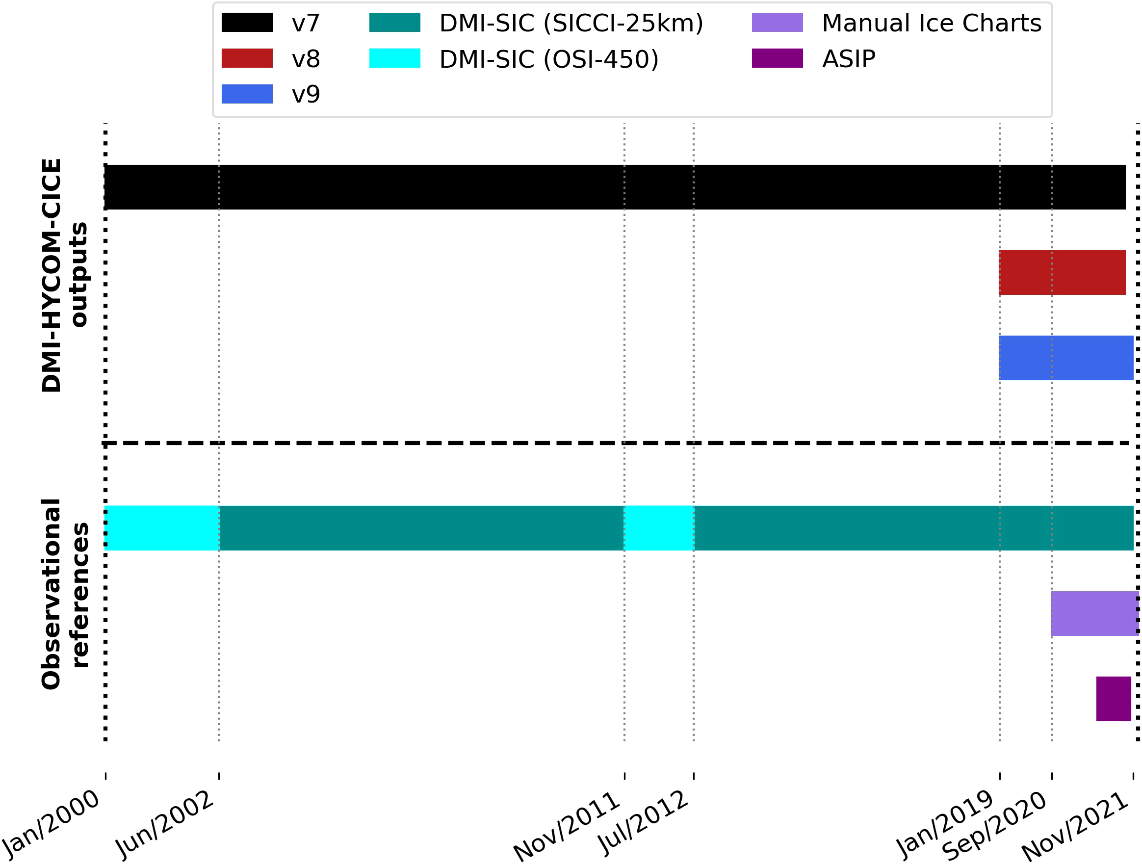 It is worthwhile to mention that the observational references (DMI-SIC and the Manual Ice Charts) used for validation purposes are different from the data assimilated by the model (OSI-401-b) and also from themselves. Except for two relatively short periods when OSI-450 is merged into the DMI-SIC product (Jan/2000–Jun/2002 and Nov/2011–Jul/2012). These two periods do not overlap the v8 and v9 experiments. Figure 2 presents an overview of the model and observational data sets used in this work regarding their time coverage.