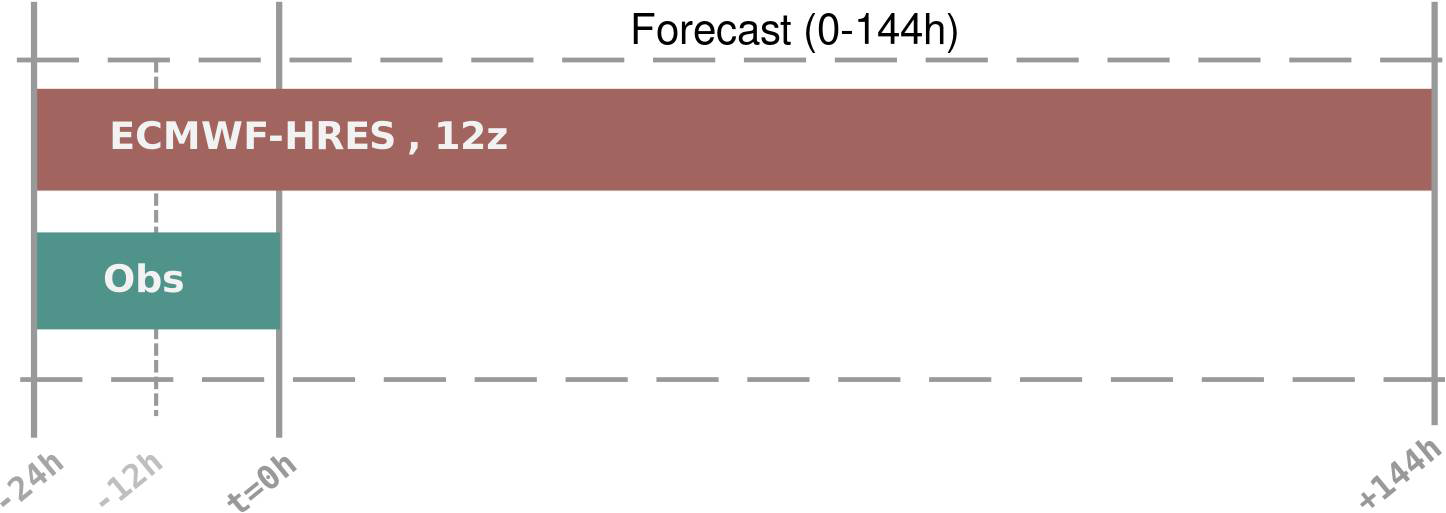 v7 is a re-analysis that assimilates sea surface temperature and sea ice concentration. The outputs from this simulation are comparable to the initial conditions of a forecast. This experiment spans Jan/2000-Aug/2021. v8 and v9 are re-forecasts that also assimilate sea surface temperatures and sea ice concentration from T=-24 to T=0, where T is hours from the initial conditions or the analysis. The v9 simulation continues from T=0 to T=144 (Figure 3). From T=0 to T=144 the re-forecast is comparable to the operational forecast run, except that the 144h atmospheric forecast consists of piece-wise 0-12h forecast slots rather than a full forecast from 0 to 144h. v8 spans Jan/2019-Sep/2021 and has been run for verification purposes. v9 also starts in Jan/2019 and keeps running to the present day as the operational version (Figure 2).