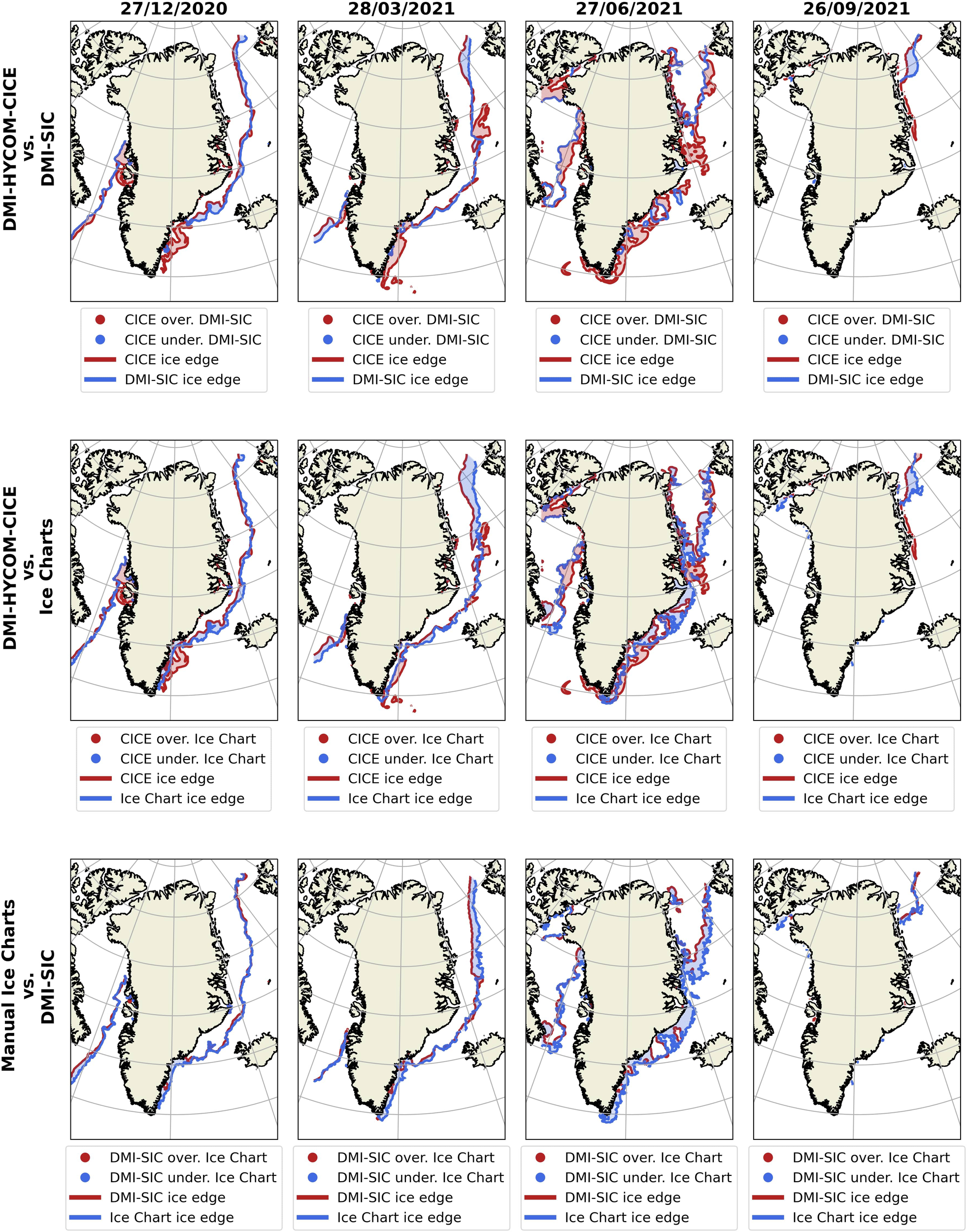 This study introduces and conducts an inter-comparison of this forecast system and the latest operational remotely sensed-based sea ice services that DMI provides. The focus is on the sea ice edge location around Greenland as this is the main focus area for DMI and, at the same time, it is an essential diagnostic for mariners.