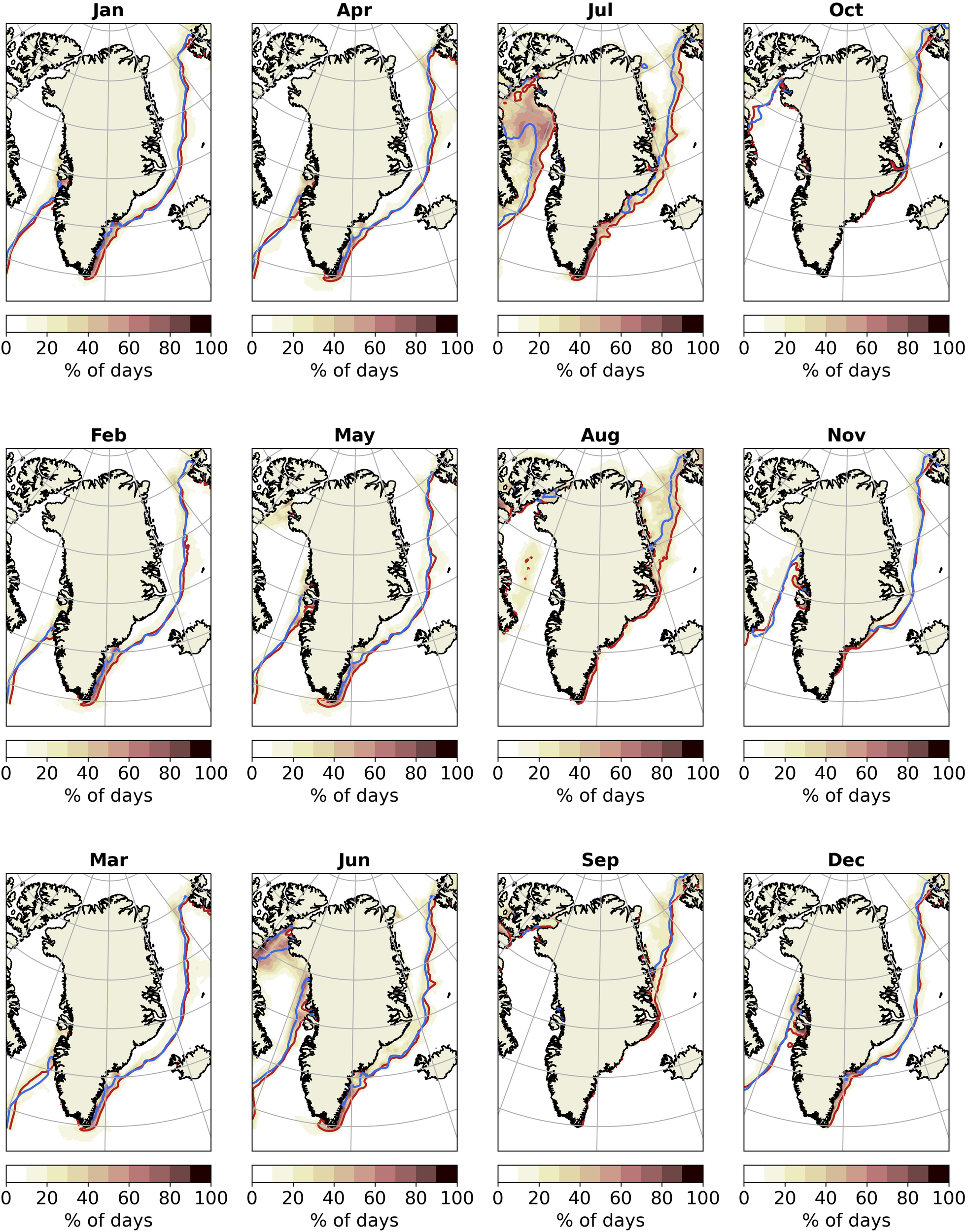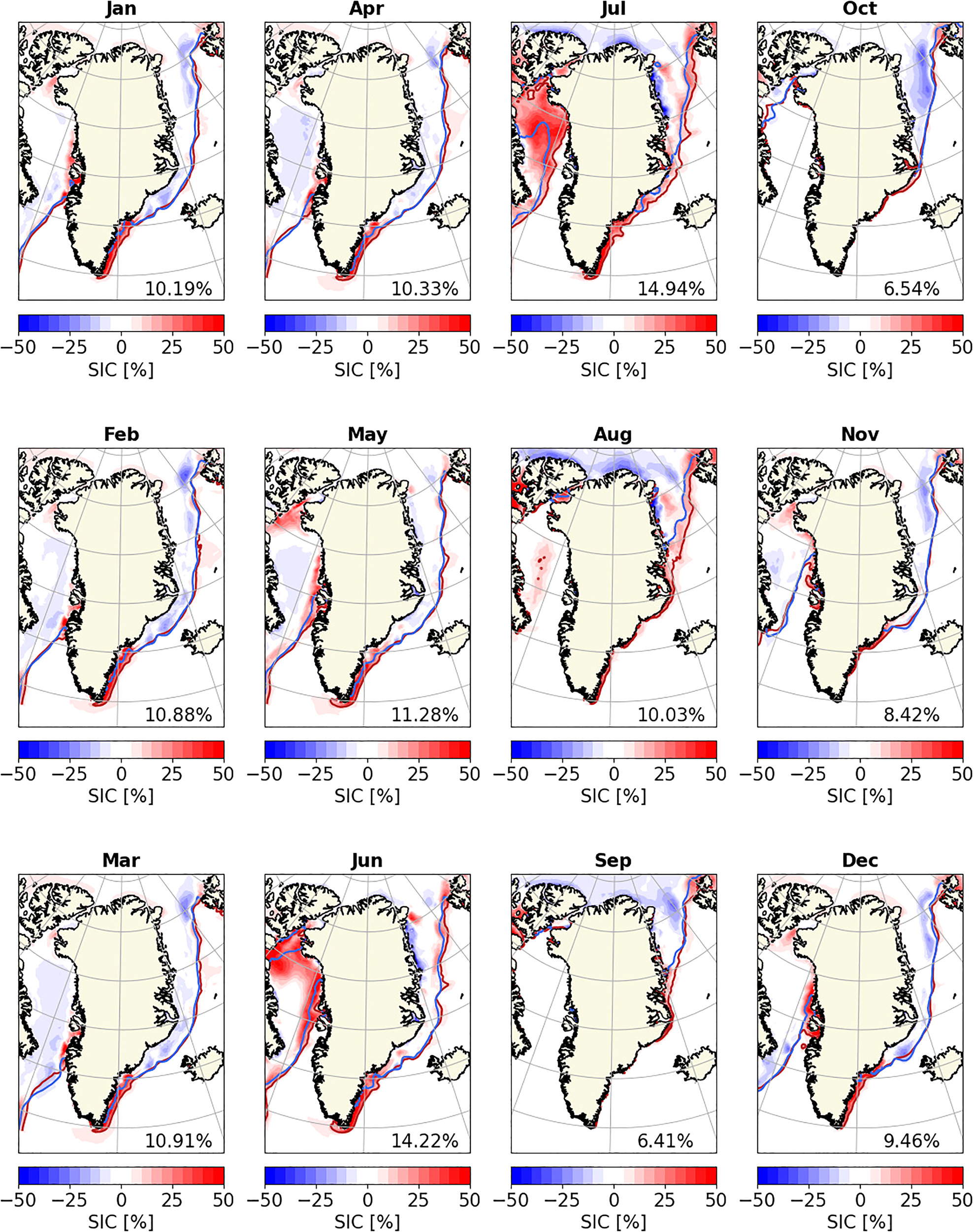 As indicated by the mean sea ice edge contour for the individual months in Figure 7 (red and blue lines), there is a striking correspondence between model and observations throughout the year in terms of monthly averages. Figure 7 also displays the cumulative occurrence of days (in percentage) that v7 outputs disagree from the observations by overestimating or underestimating the sea ice edge. Again, the main differences are observed in the warmer seasons, mainly in June and July, in the northern Baffin Bay. Some mismatches also take place during summer off eastern Greenlandic coast, when the modeled ice edge is further offshore than the observed sea ice edge. Nevertheless, the maximum percentage of days in which mismatches take place in the eastern ice edge does not exceed 30–40% in August. Such a difference is even smaller in June, July, and September.