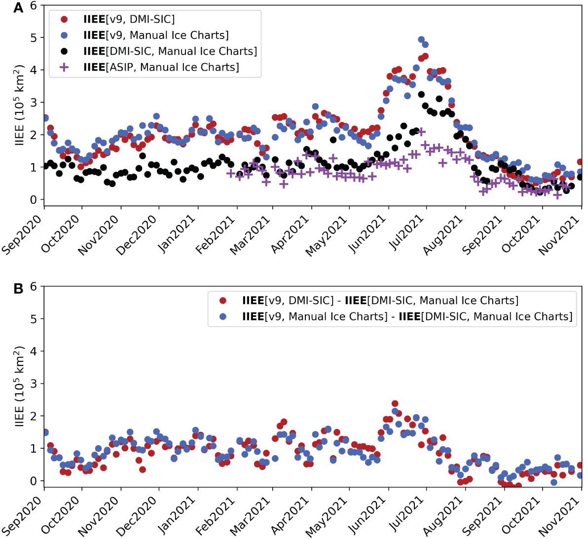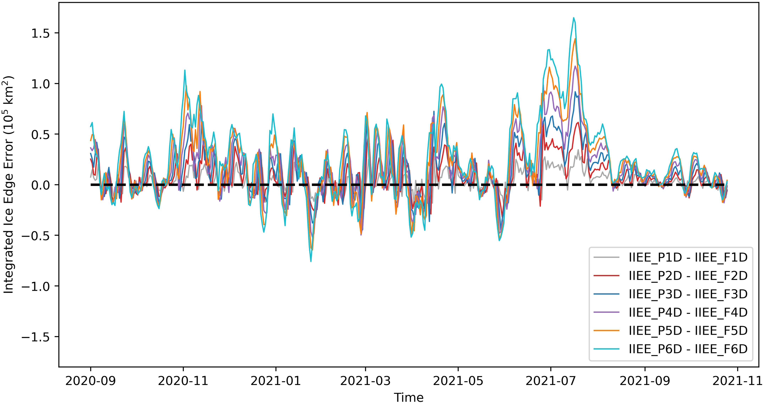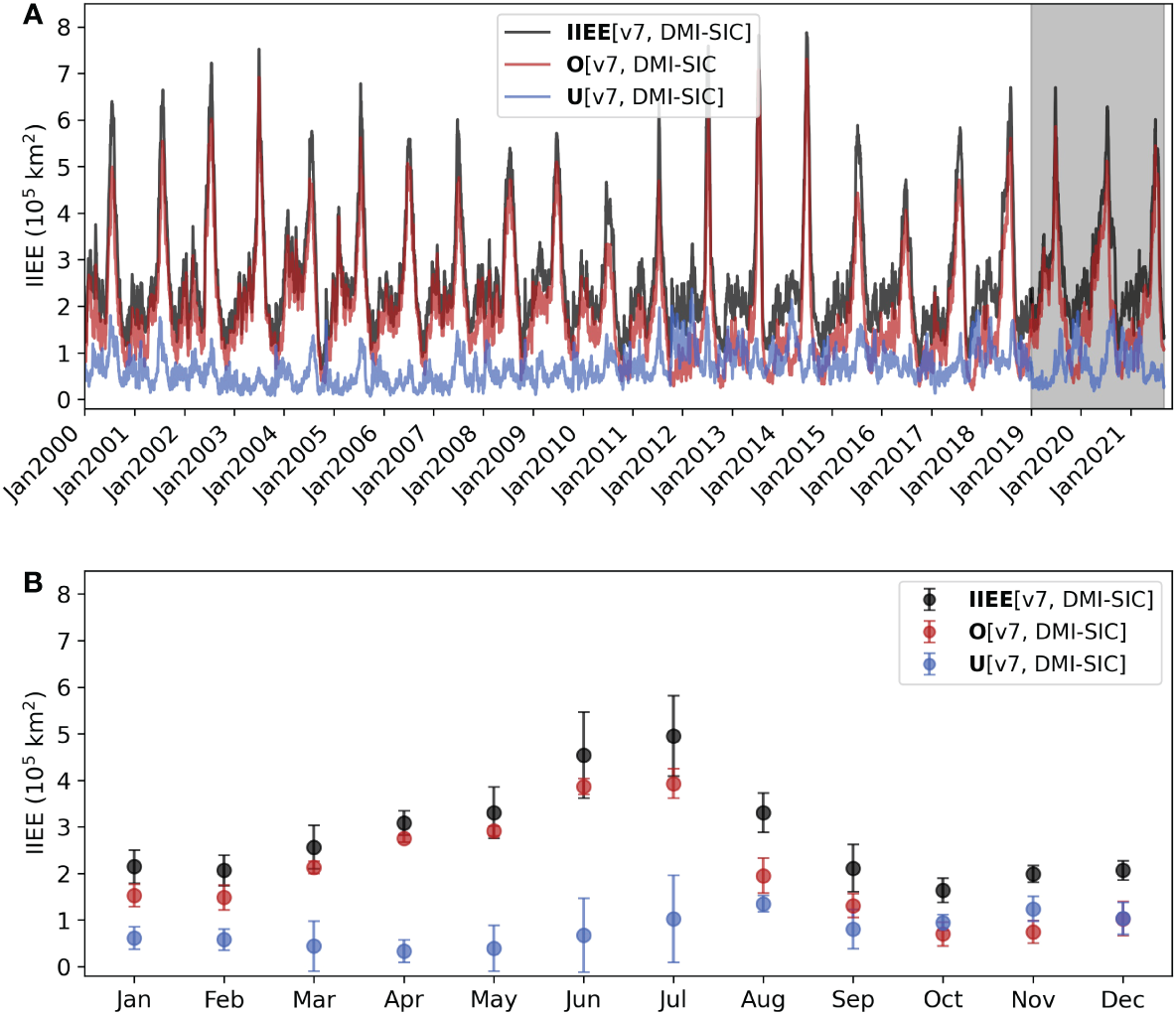 The IIEE has a marked seasonal variation with values that grow throughout the melt season and peak in July when IIEE = 4.95(± 0.86)× 105 km2 (Figure 6B). In the period from Sep–Mar, the IIEE is smaller than 2.60 × 105 km2 . The IIEE growth in the melt season is mainly linked to the errors associated with an overestimation of the sea ice edge by the model (Figures 6A, B).