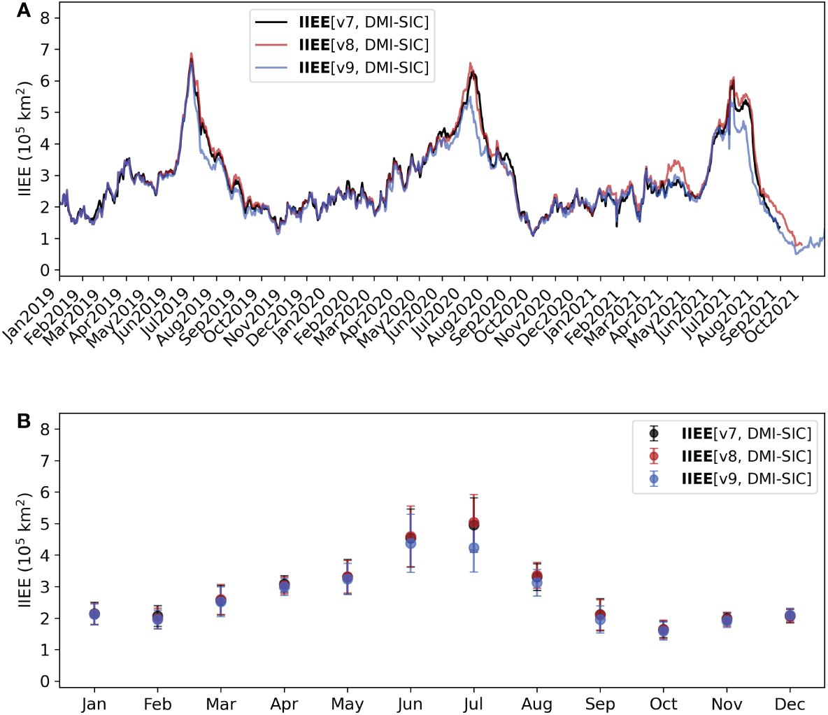 (A) Integrated Ice Edge Error (IIEE) estimated between the v7 (black line), v8 (red line), and v9 (blue line) experiments and DMI-SIC. (B) Average monthly IIEE calculated for the time series displayed in (A), calculated for the period Jan/2000–Dec/2020. Vertical bars indicate the 1-standard deviation interval.